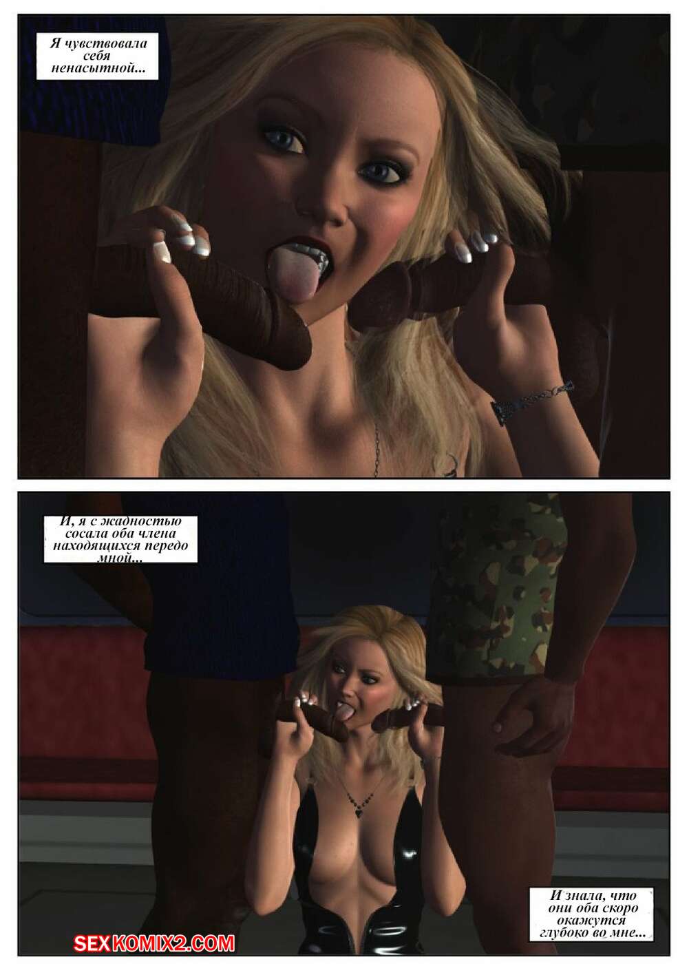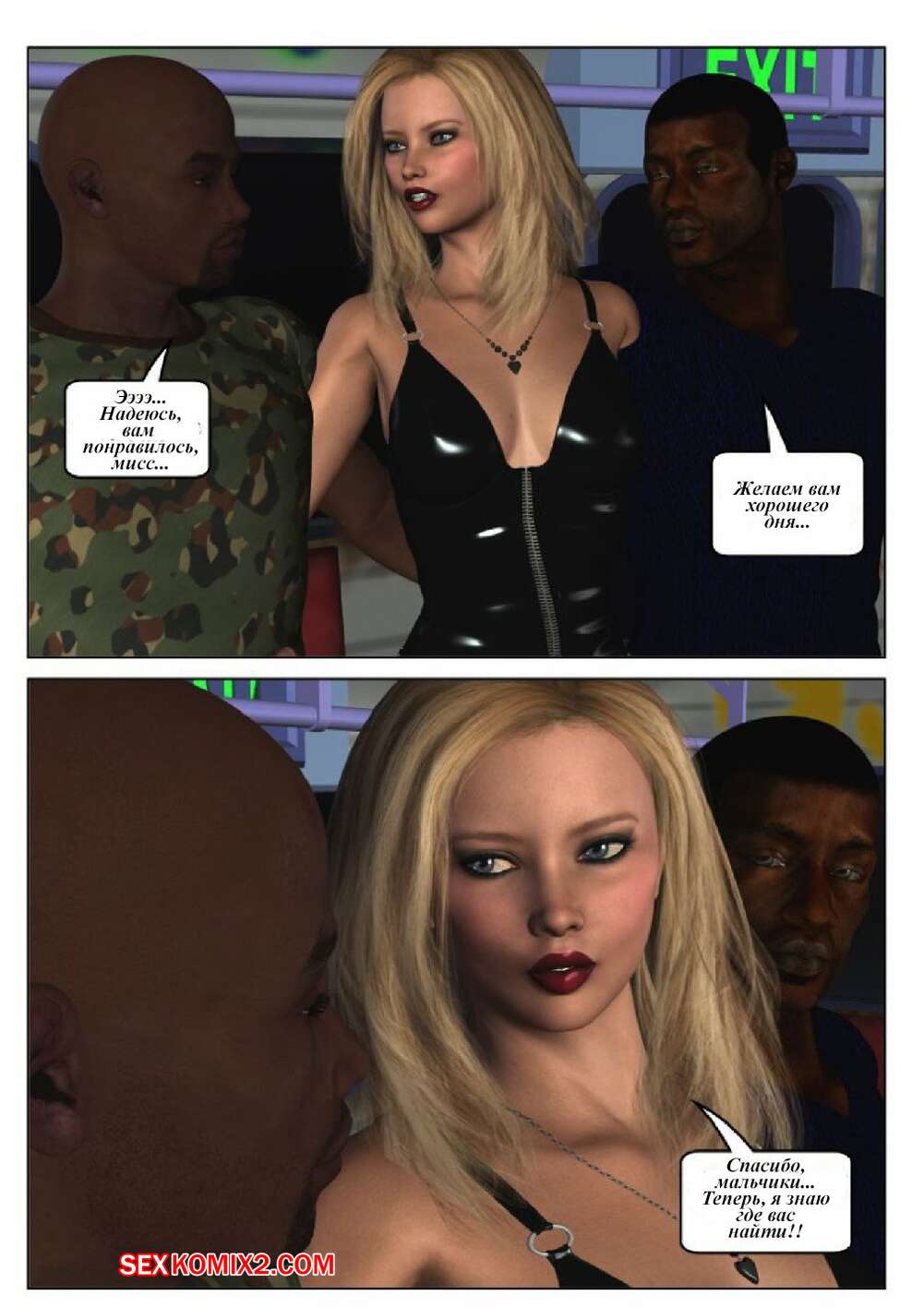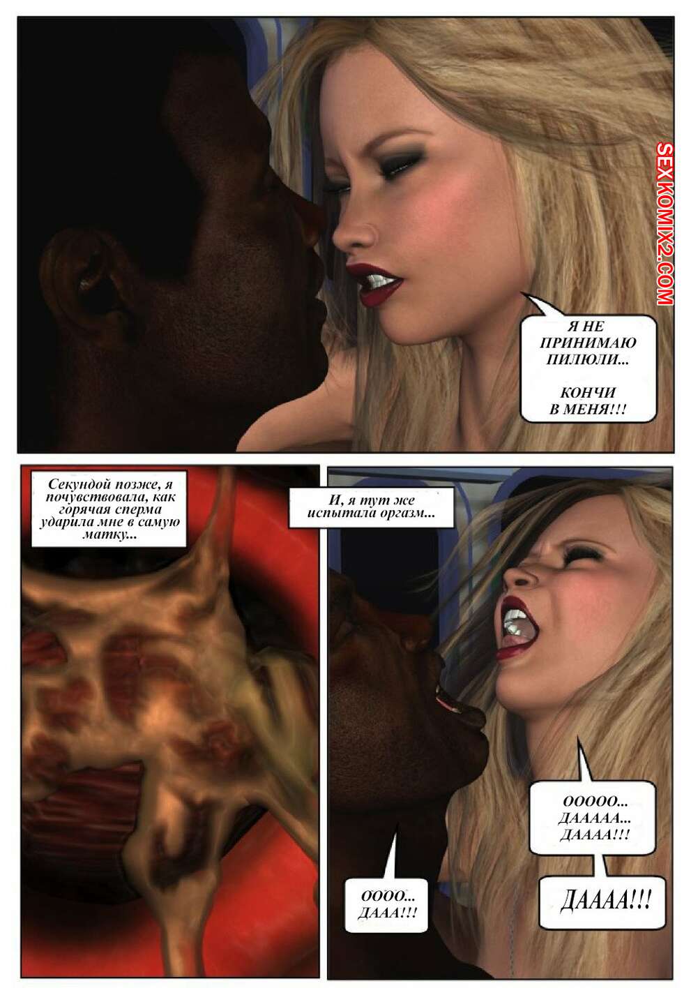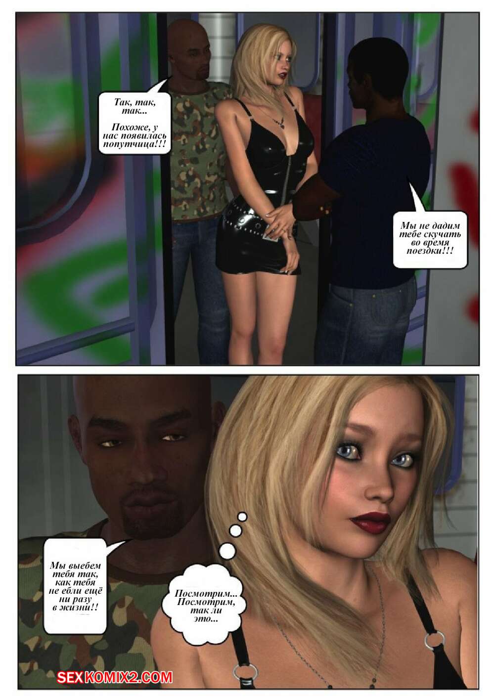 Порно комикс 50 оттенков чёрного. Часть 6 Горячая сисястая красотка блондинка встретилась в местро с двумя черными парнями. Они раздели ее и дали ей отсосать свои большие хуи, после чего они ее хорошенько выебали во все дырочки.