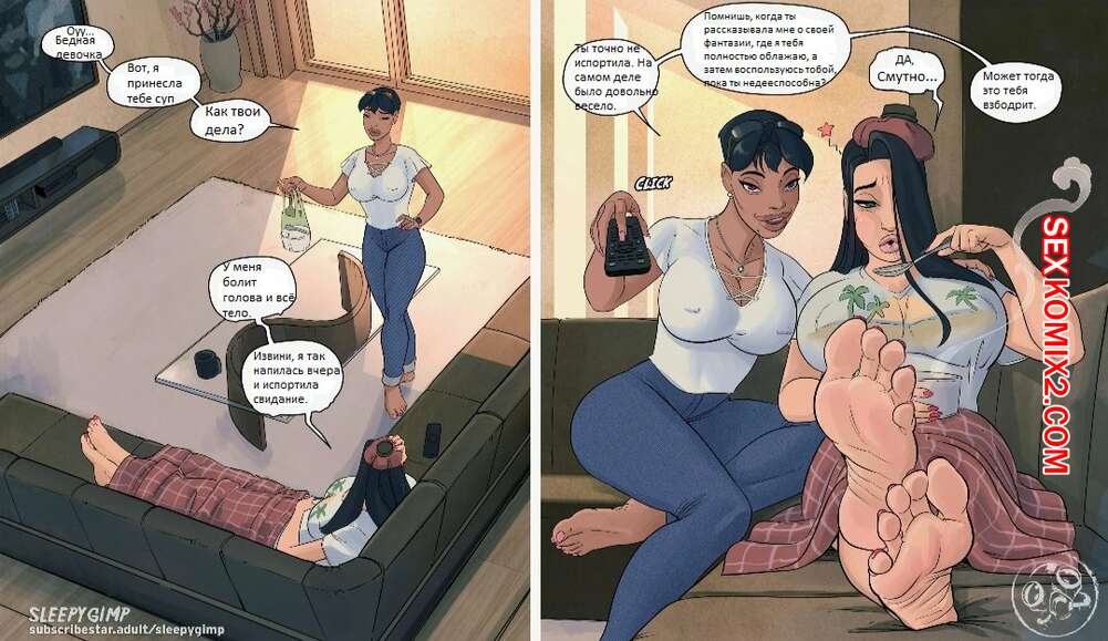 Порно комикс Свидание. Date night. SleepyGimp Горячая сисястая милфа брюнетка пригласила к себе свою подругу, чтобы показать ей запись скрытой камеры. На нее она раздела подругу и стала полностью ублажать ее шикарное тело.