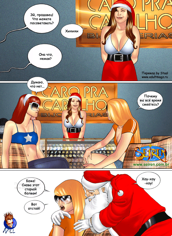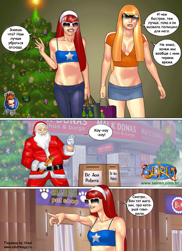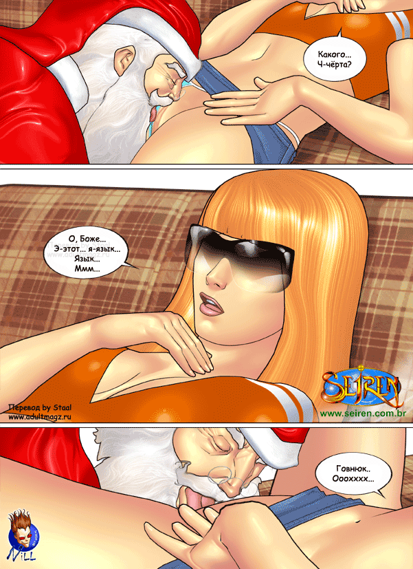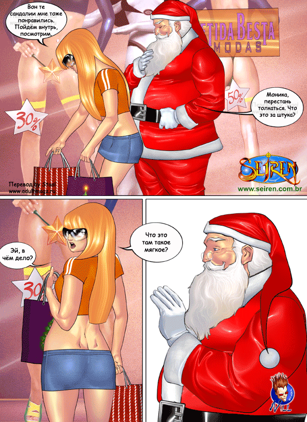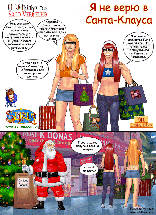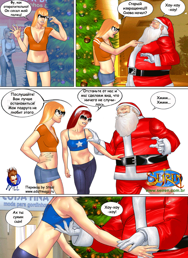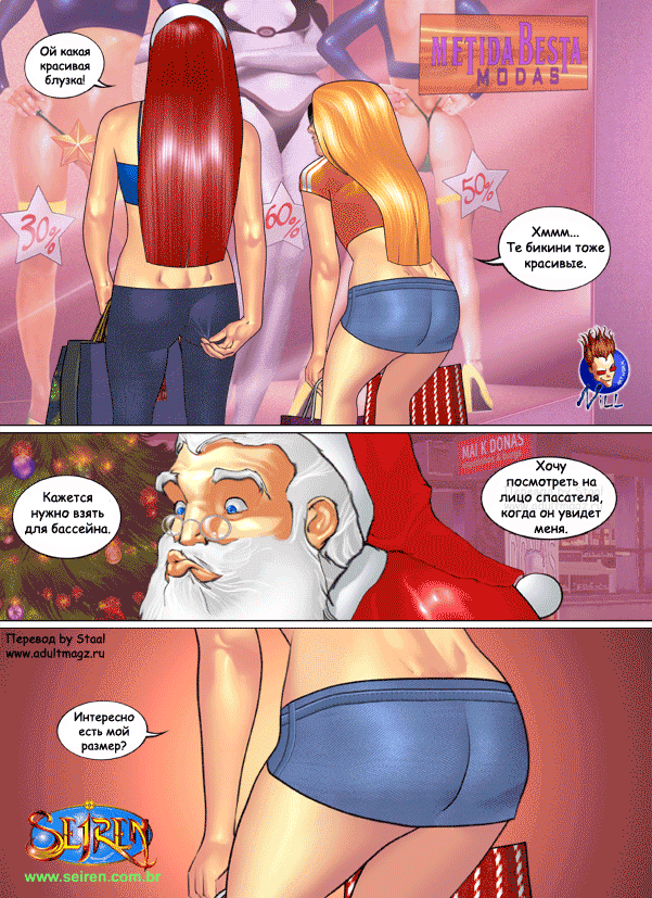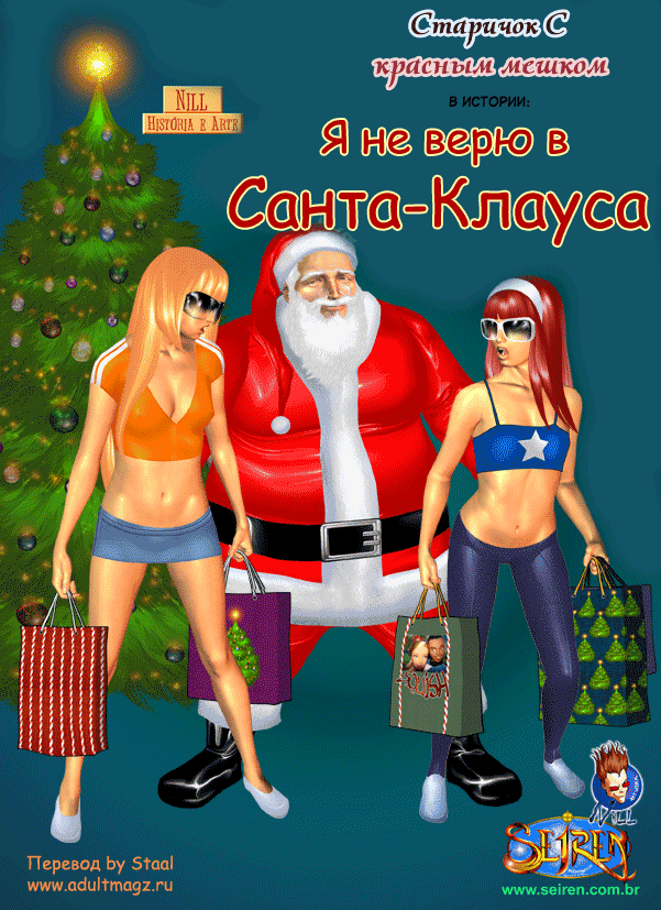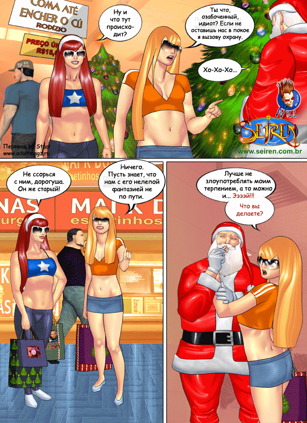 Порно комикс Они не верили в Санту Санта Клаус положил глаз на двух горячих красоток в торговом центре. Он соблазнил их своим большим хуем и стал их ласкать, после чего дал сучкам у себя отсосать и хорошенько их выебал.
