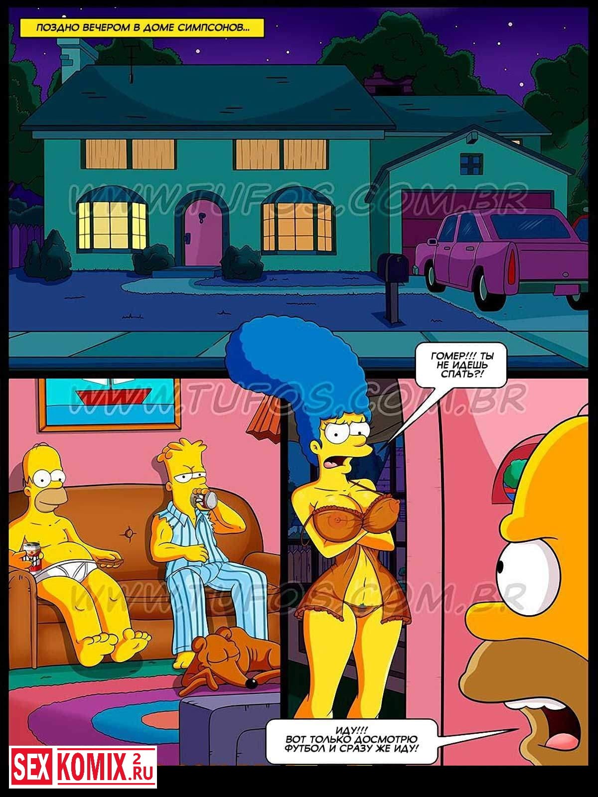 Порно комикс Симпсоны. Часть 1. Футбол и пиво. И, так, вечер, по телевизору футбол. Гомер, потягивая пивко, наслаждается игрой. А Мардж ждёт совсем других наслаждений, и зовёт Гомера в постель. Он обещает прийти, когда закончится игра, и бежит в туалет пописать. И тут Мардж замечает, что Барт тоже пьёт пиво, и спрашивает его с каких это пор он начал пьянствовать? А тот отвечает, что он стал пить пиво с тех пор, как ему исполнилось 18. И тут Мардж вспомнила, что Барту действительно уже 18! И это наталкивает её на определенную мысль.
