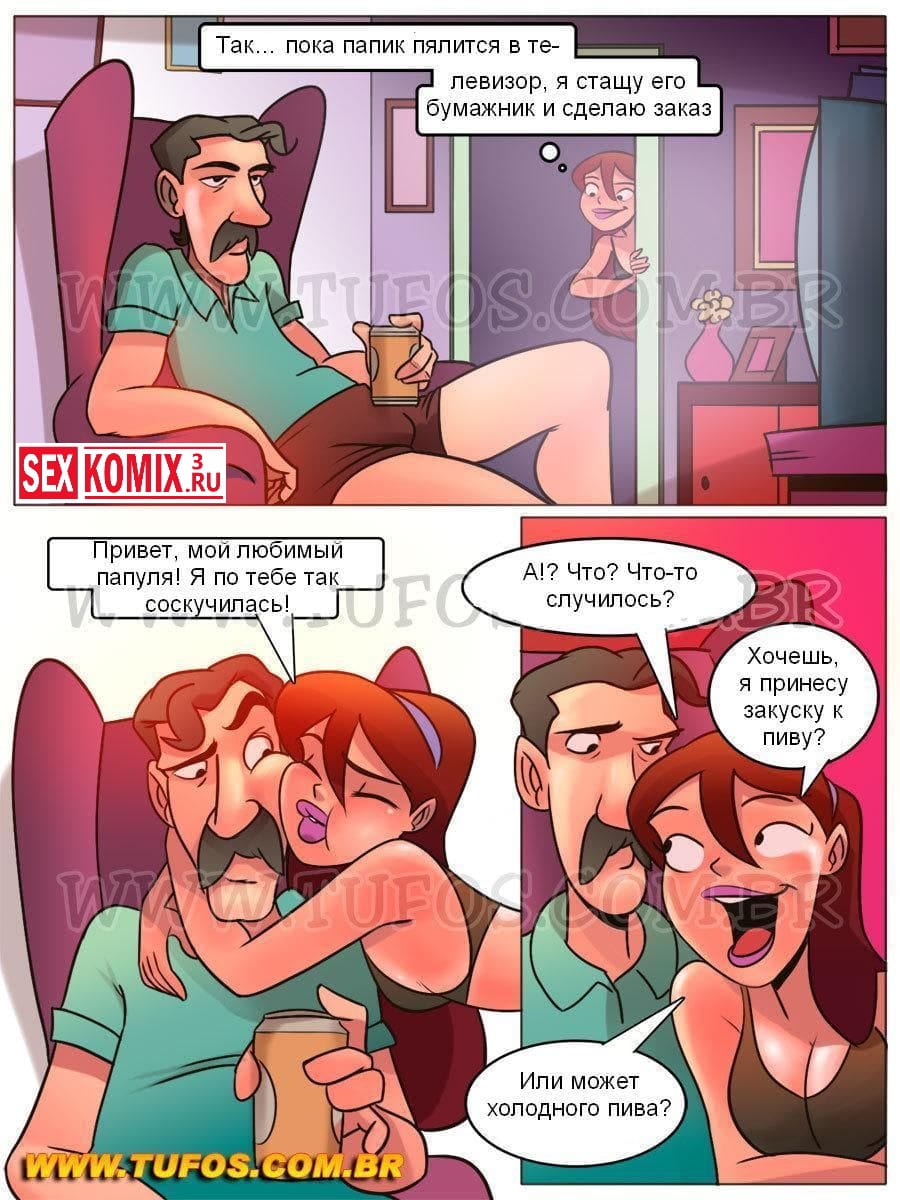 Читайте секс комикс «Похотливая семейка. Часть 11. Трусики Анины». В данной части порно комикса вы узнаете, что Анине понадобились деньги на новые трусики, в которых она хочет пойти на свидание. Но вот только, как уговорить папочку, чтобы он дал ей денег на покупку?