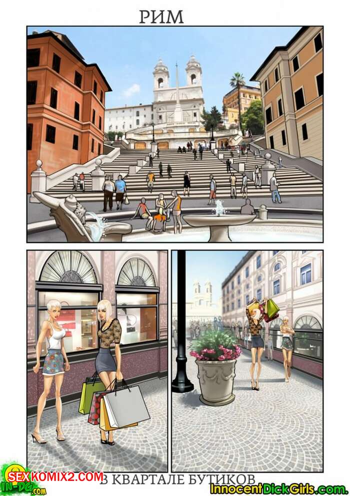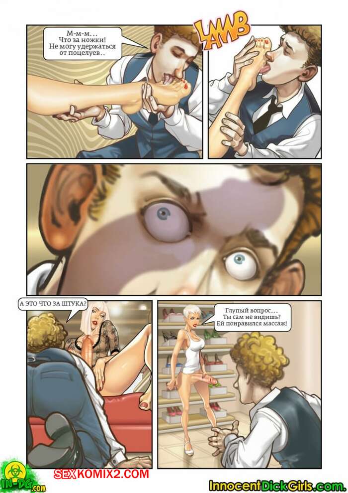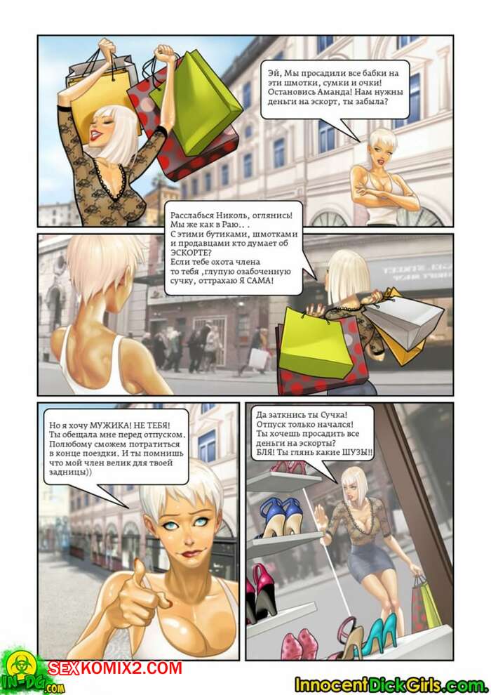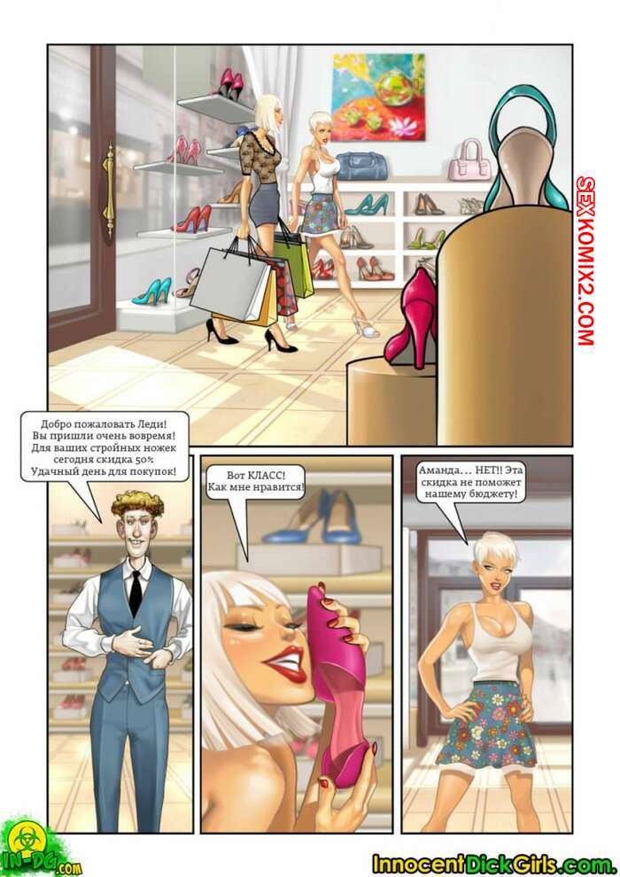 Порно комикс Шопоголики. InnocentDickGirls Сисястая милфа блондинка с большим хуем отправилась в магазин со своей подругой. Там они решили повеселиться с продавцом и устроили для сучки двойное проникновение.
