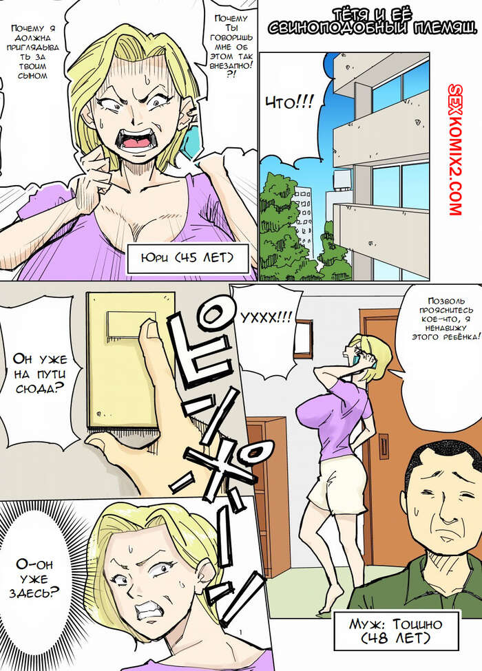Порно комикс Тётя и её свиноподобный племяш. Yurie to Buta Сисястая милфа блондинка очень хотела трахаться, поэтому она решила повеселиться со своим жирным племянником. Она разделась и стала сосать его большой хуй, после чего дала ему себя выебать.