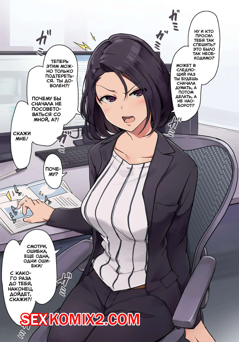 Порно комикс Тайные отношения с начальницей. Onna Joushi to Ura de Nikutaikankei o Motsu Ohanashi Сисястая милфа брюнетка любит трахаться, поэтому она решила соблазнить своего подчиненного. Она разделась перед ним и стала сосать его большой хуй, после чего дала ему себя выебать.