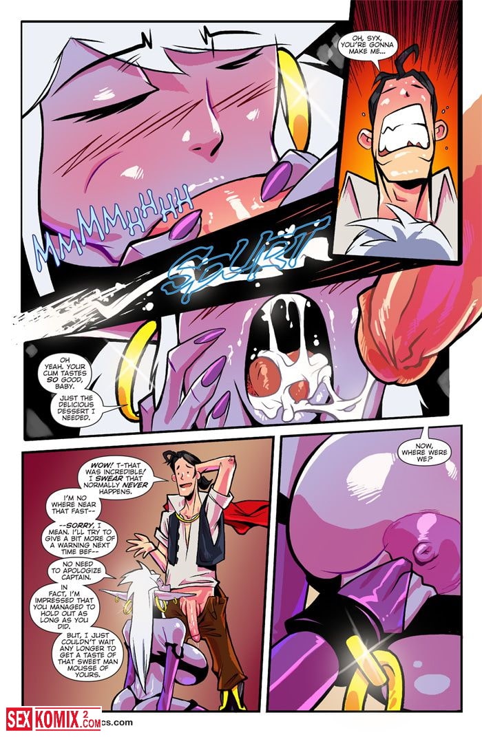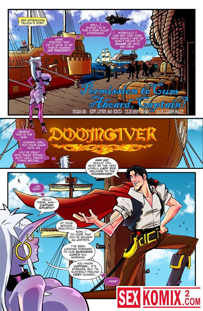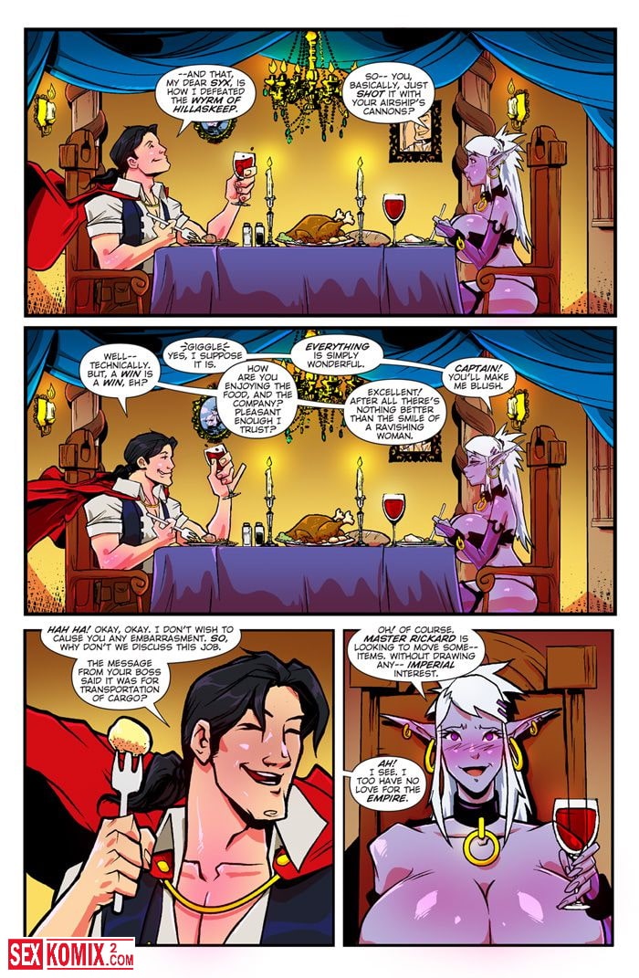 Порно комикс Мир Маны. Часть 5. Кончить на борту. Английский. Глубокожая красотка с большими сиськами гуляла по пристани и ей повстречался капитан корабля, который стоял в гавани. Он пригласил эльфийку на корабль, чтобы угостить ужином. Пока они ели мужчина рассказывал о своих подвигах и гостья потекла.