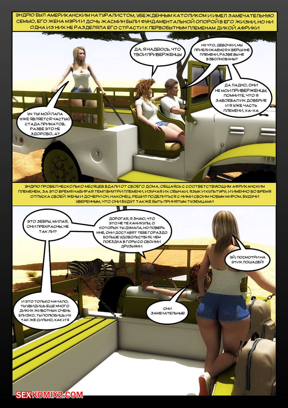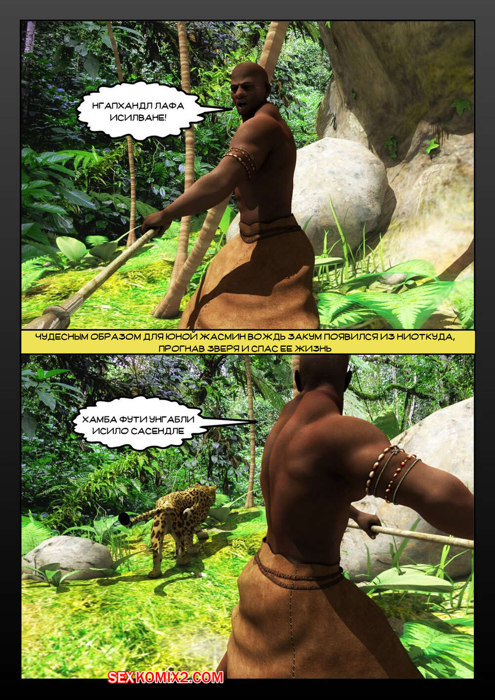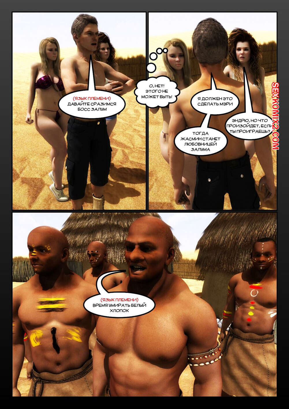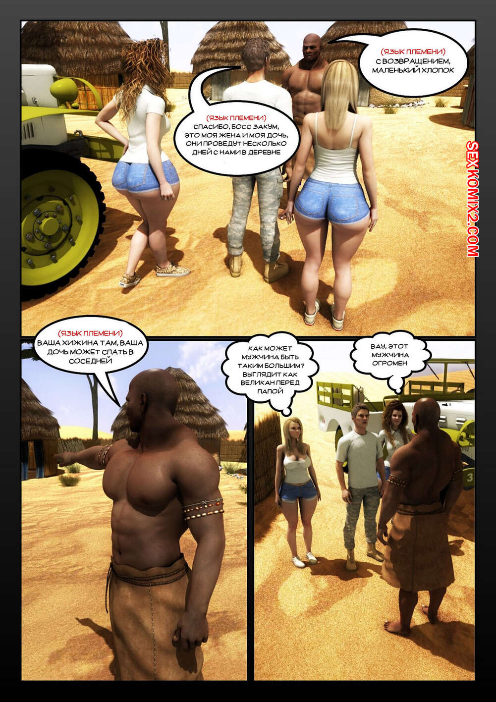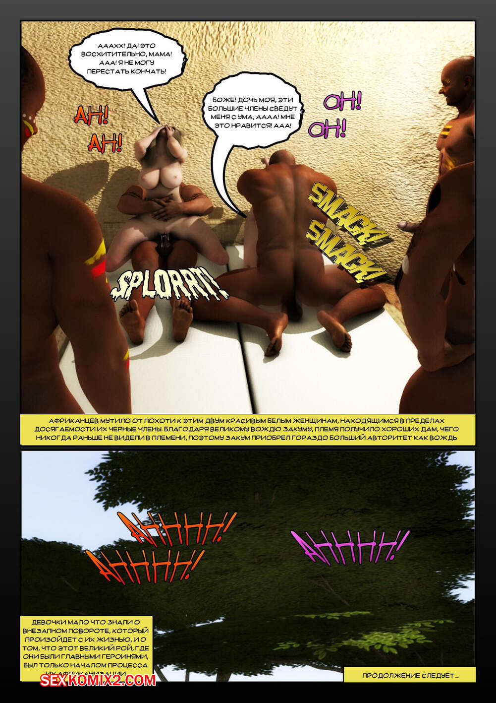 Порно комикс Африканизированный. Часть 4. Africanized Сисястые милфы оказались в племени черных парней, которые позвали сучек повеселиться с ними. Девушки разделись и стали сосать большие хуи парней, после чего дали им себя выебать.