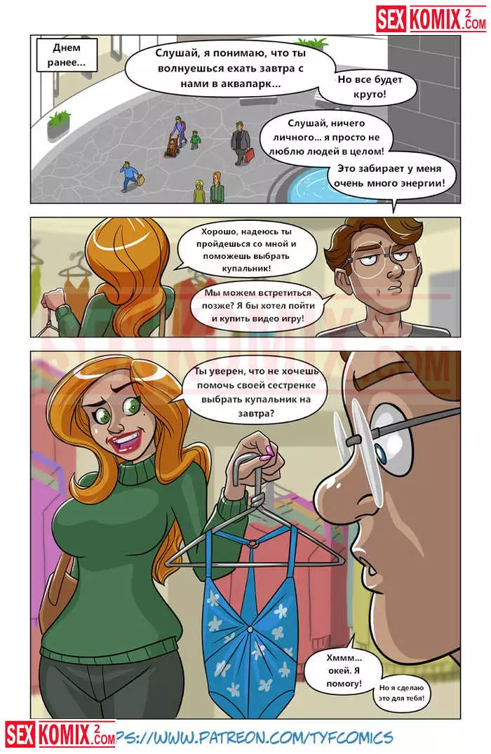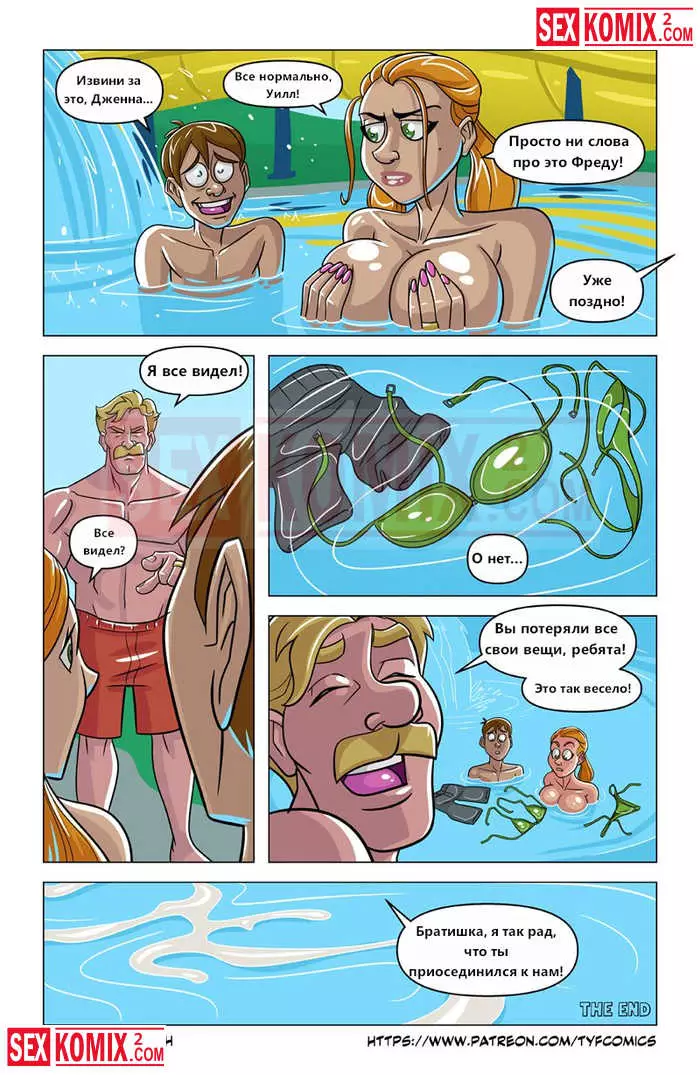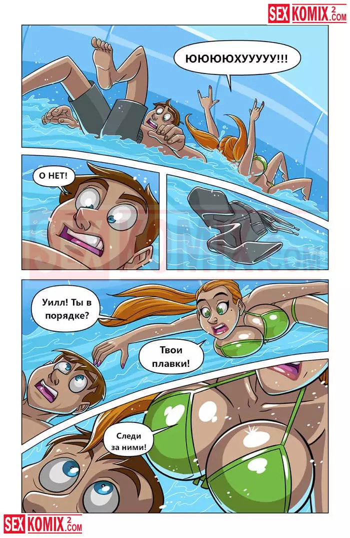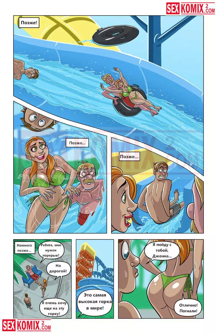 Порно комикс Аквапарк. Парень покатался на водной горке и увидел сиськастую блондинку в воде. Он пространственно скатился с холма и оторвал детёныша. Теперь ее грудь была обнажена, а его член стоял как камень.