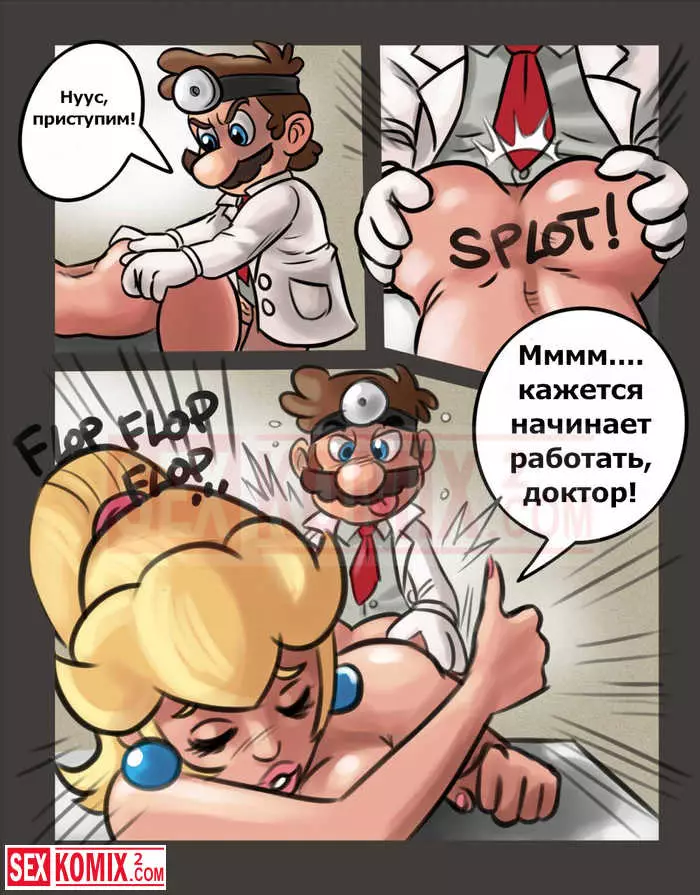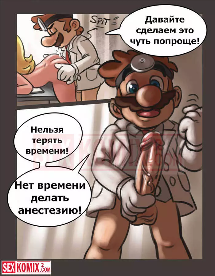Порно комикс Доктор Марио. Марио нашёл в себе способности психотерапевта и открыл свою клинику. Сразу же к нему на приём записалась очень симпатичная и сексуальная блондинка, которая была принцессой. У нее был очень большой стресс после встречи с огромным драконом. Марио попросил рассказать подробности, что с ней произошло. После её истории он понял, что ей поможет хороший расслабление с помощью секса.