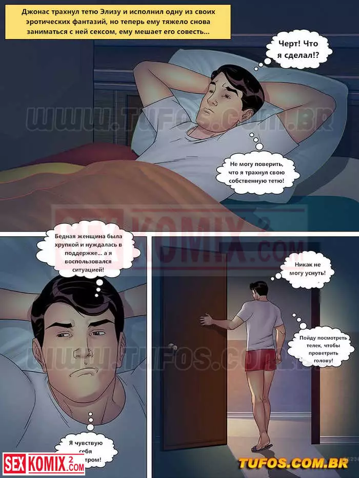 Порно комикс Тетя, кузины и племянник. Часть 5. Спасаясь от искушения. После секса с горячей женщиной, парень никак не мог забыть об этом. Он пошёл к ней, чтобы извиниться, но это привело к новому сексу.