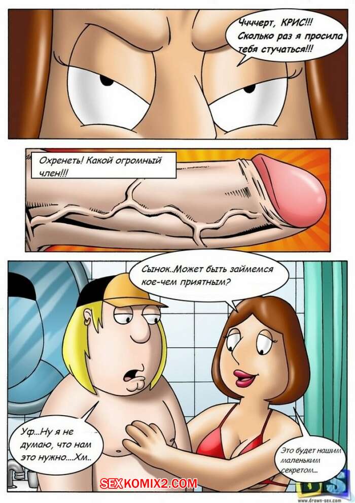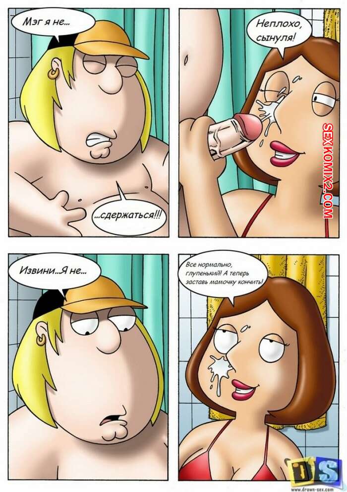 Порно комикс Гриффины. Крис и Мег Парень пошел мыться в ванну и застал там свою горячую мамку голой. Она увидела твердый член парня и очень возбудилась. Сучка стала сосать хуй сына, после чего дала ему себя выебать.