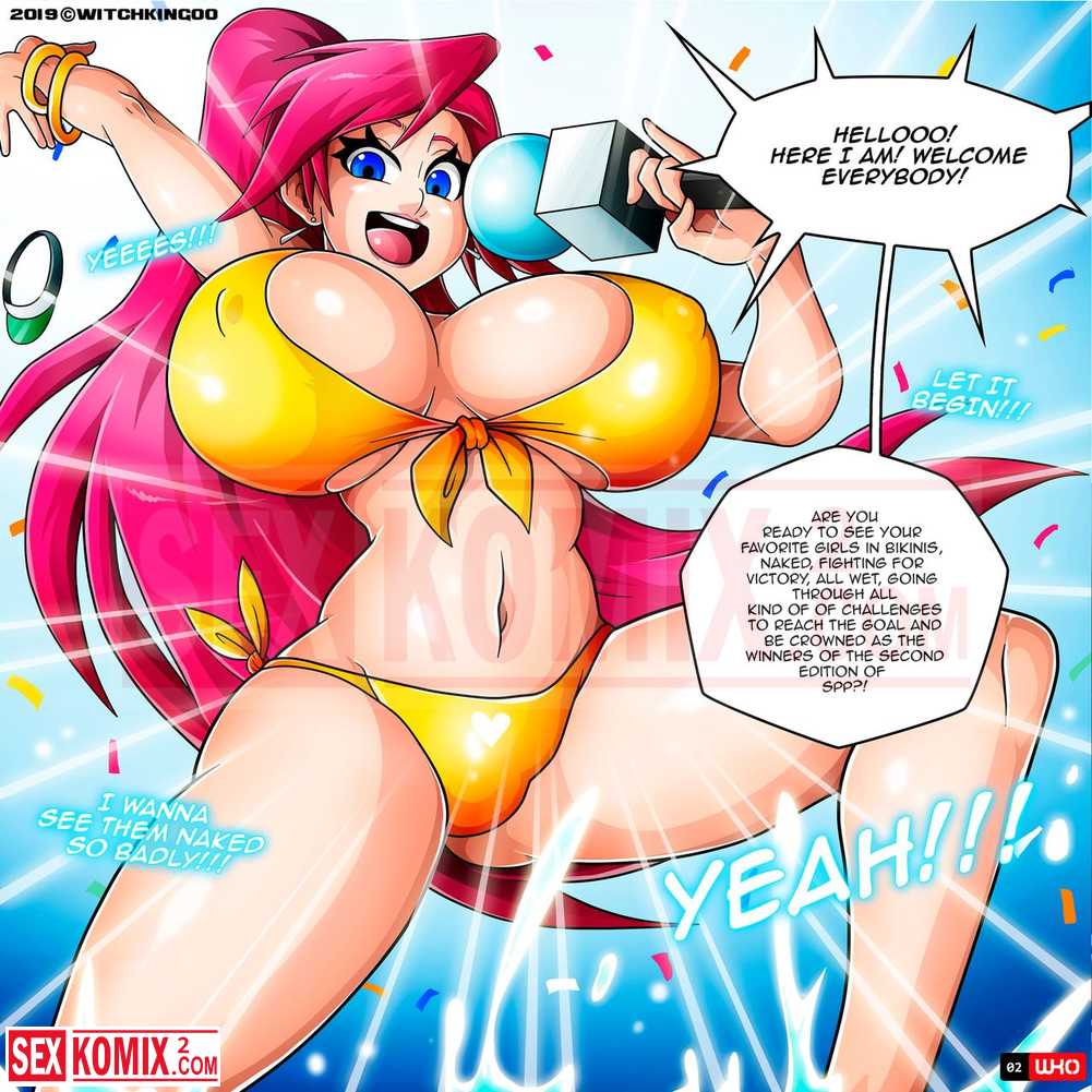 Порно комикс Игры в бассейне. Часть 2. Английский. Развратные красотки с большими сиськами продолжают бороться в воде, они почти все без купальником и видно огромные сиськи.