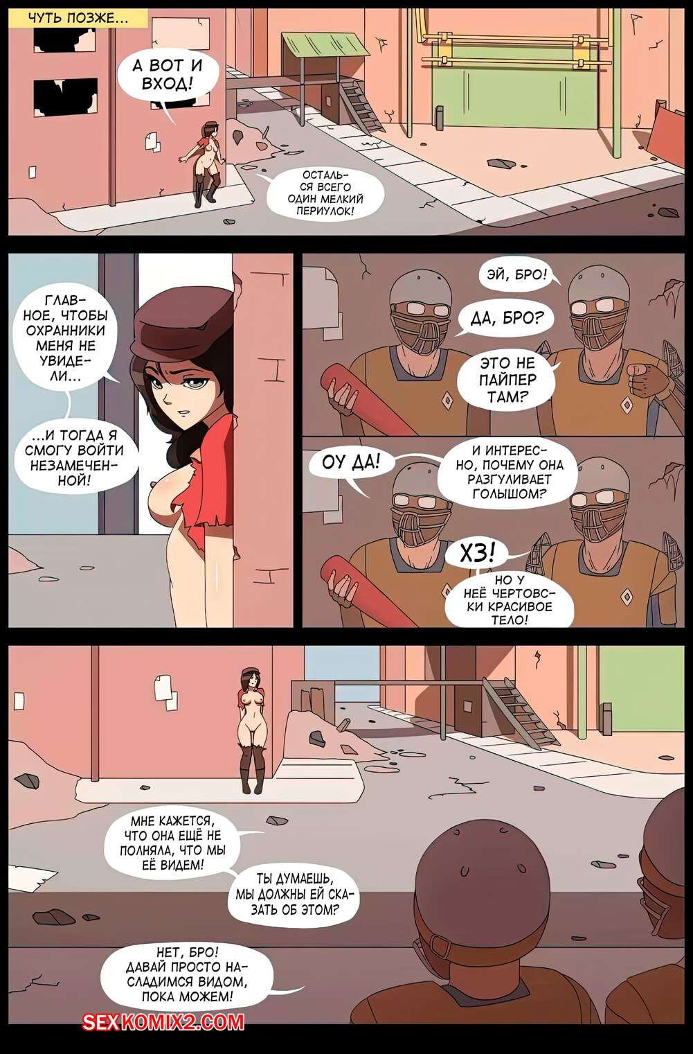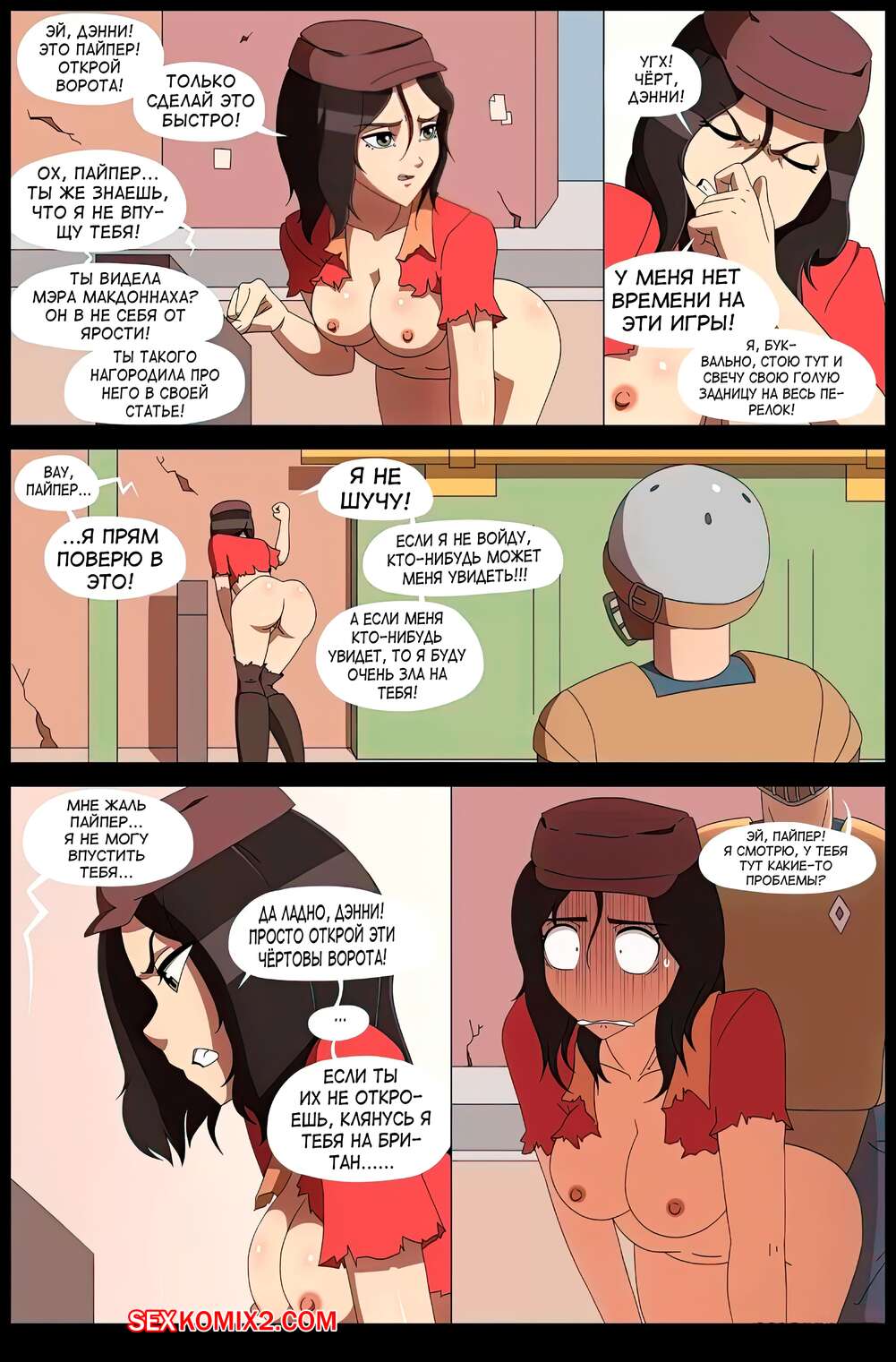 Порно комикс Fallout. Публичная нагота Пайпер. Aurorazone Горячая сисястая брюнетка оказалась голой на улице и парни сразу заметили это. Они стали ласкать сиськи девушки и ее влажную пизденку, но за нее быстро заступислся ее дружок.
