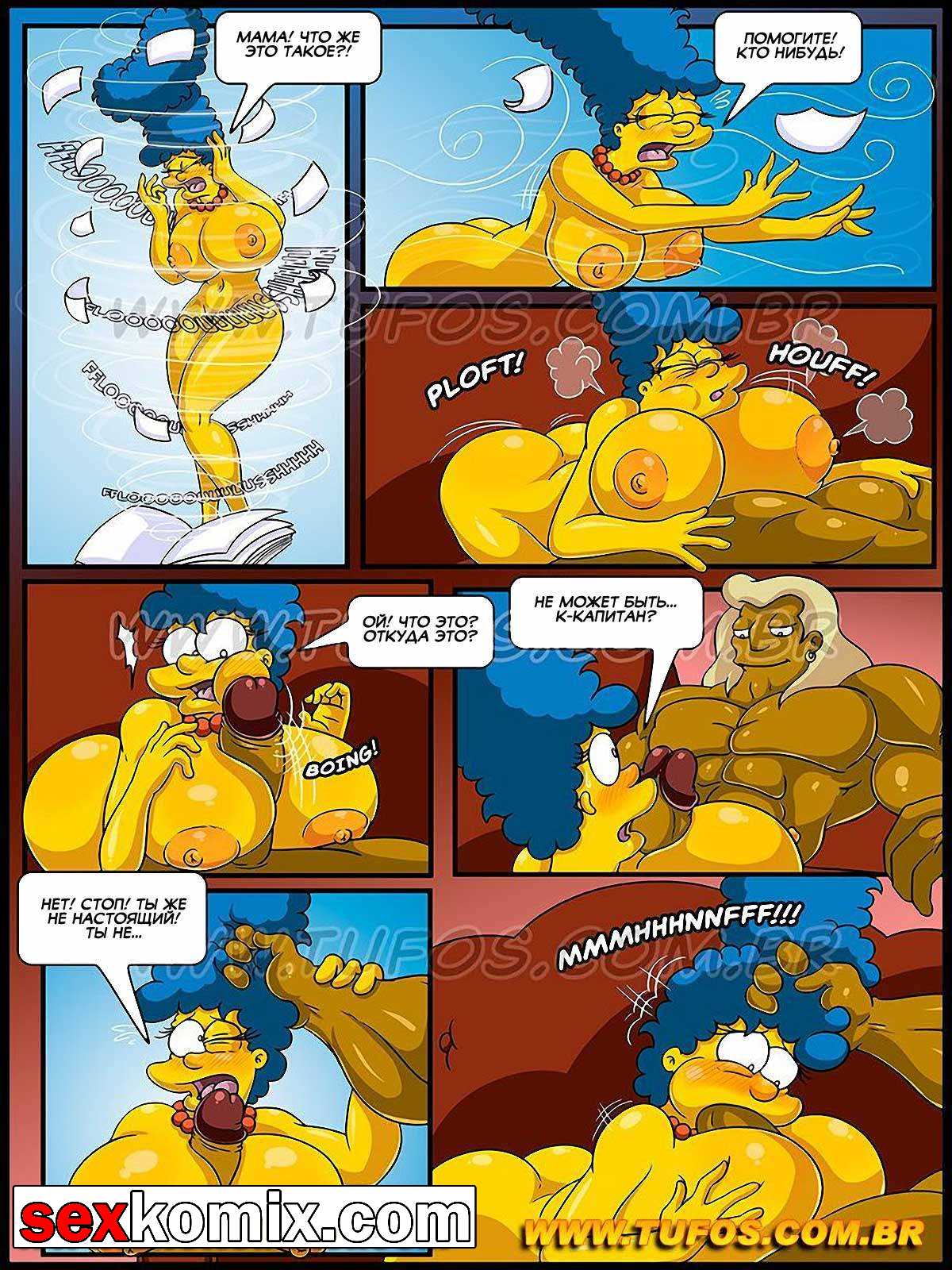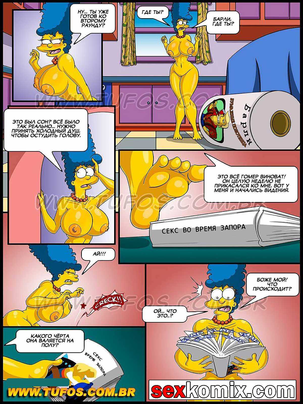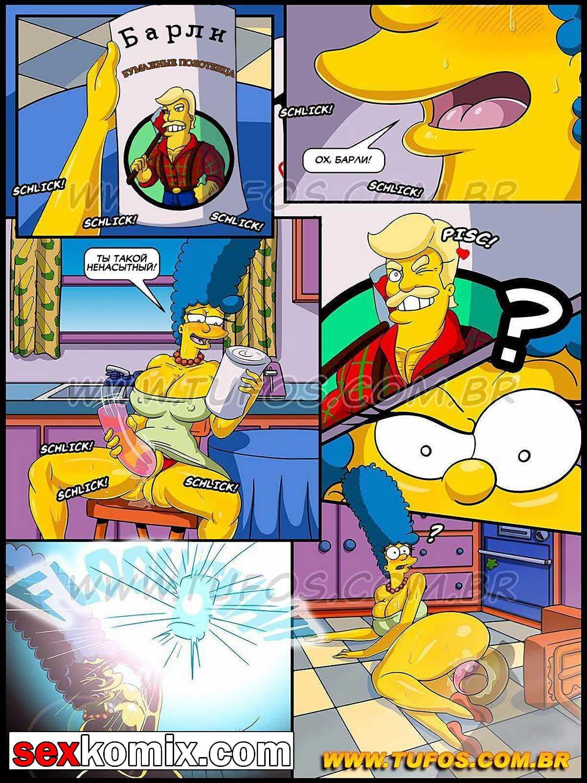 Порно комикс Симпсоны. Часть 4. Эротические фантазии. В этой части секс комикса вы узнаете, как у сочной милфы Мардж, от длительного воздержания начались видения. Она начала видеть воображаемых голых мужиков с большими членами, которые её отлично трахают. На банке к бобами изображен мускулистый фермер, как только женщина его видит, он уже в её комнате со стоящим членом.