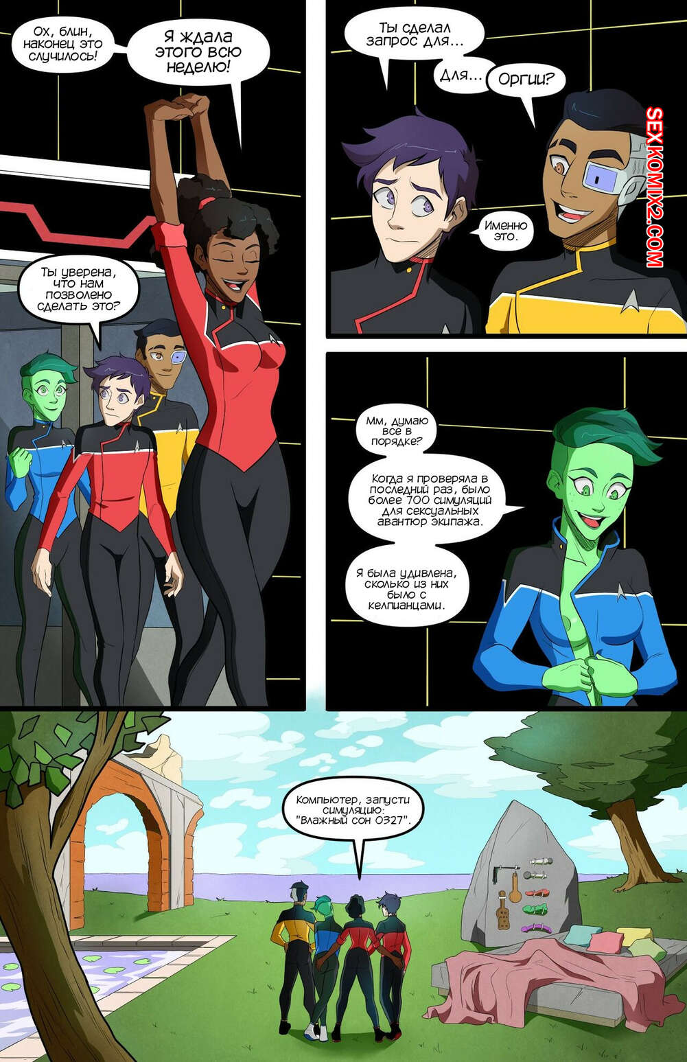 Порно комикс Оргия Симуляторы. Orgy Simulation. Star Trek. Lower Decks. Swain Друзья решила расслабиться после работы и устроить оргию. Они запустили симуляцию и поспешили раздеться, после чего стали ласкать друг друга, получая огромное удовольствие.