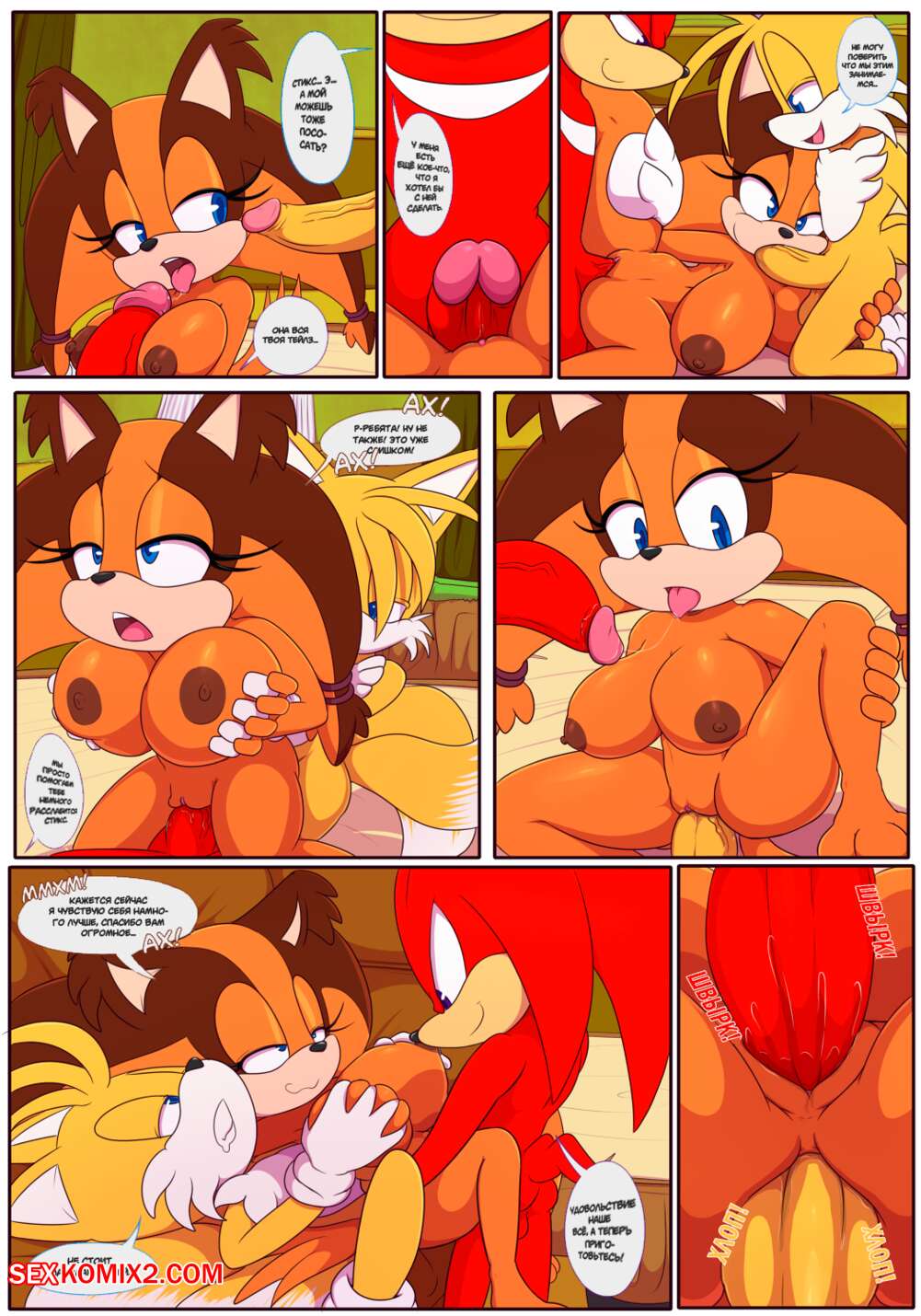 Порно комикс Sonic The Hedgehog. Дикая Стикс. NyuroraXBigdon Сексуальная красотка была очень возбуждена и хотела трахаться. Она разделась перед своими дружками и стала сосать их большие хуи, после чего дала им себяв выебать во все дырочки.
