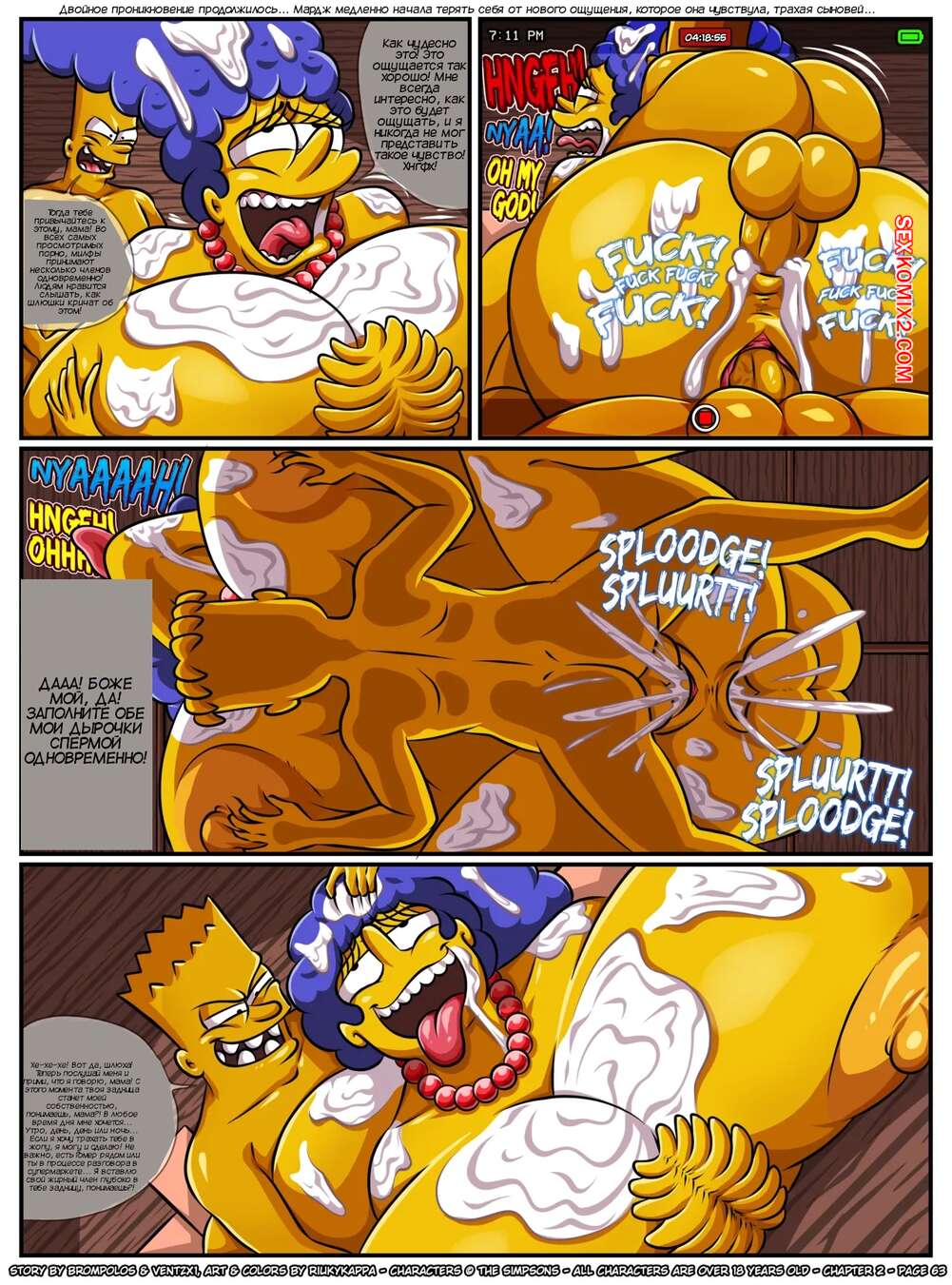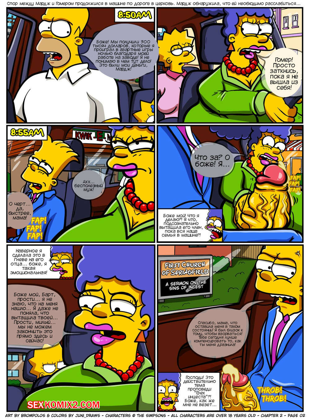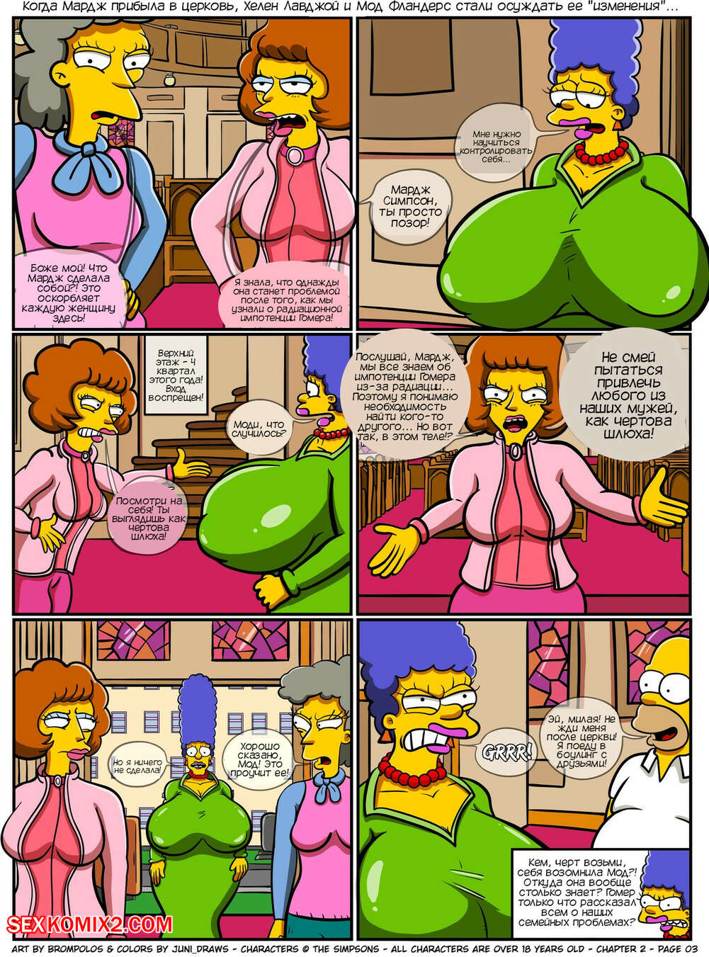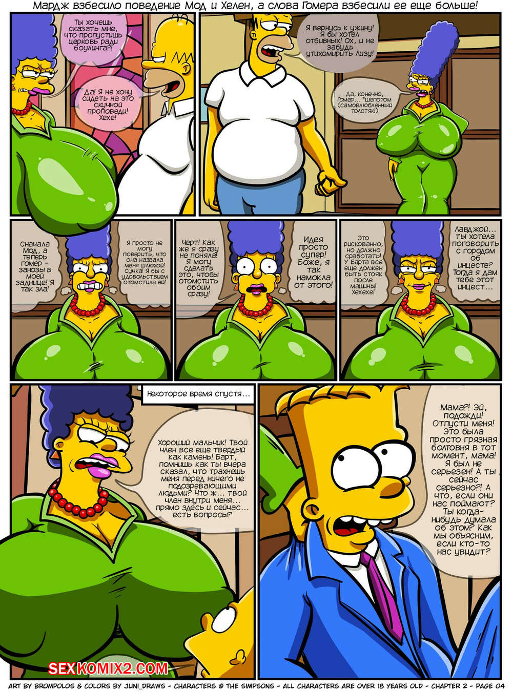 Порно комикс Симпсоны. Сексенштейны. Материнские семейные проблемы. Часть 2. Brompolos Сексуальная милфа Мардж отправилась со своей семьей в церковь. Там милфа невероятно возбудилась и позвала Барта уединиться, чтобы он ее хорошенько выебал и доставил ей огромное удовольствие.