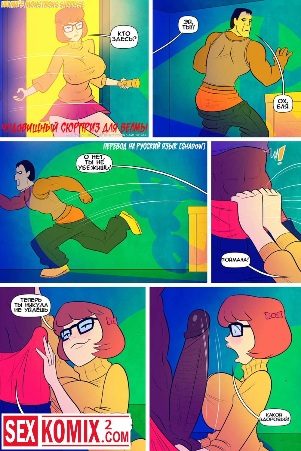 Порно комикс Чудовищный Сюрприз для Вельмы. Девушка детектив поймала белого парня за преступлением и хотела его поймать, он оказался черным с большим членом. Парень трахнул красотку.