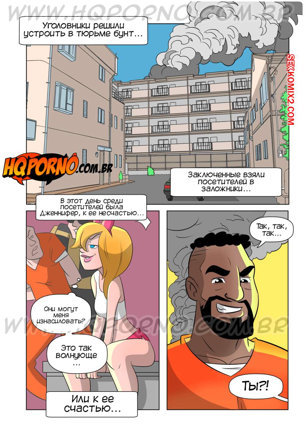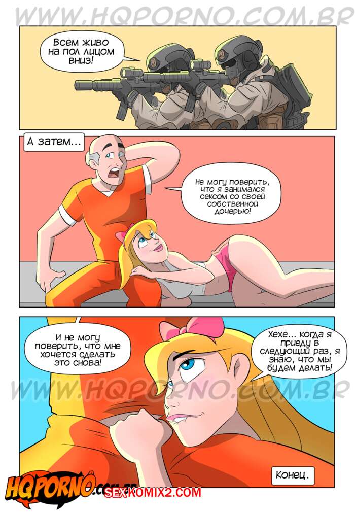Порно комикс Извращенцы. Часть 10. Бунт. Os pervertidos. Hqporno Сексуальная блондинка пришла в тюрьму и в этот момент там произошел бунт. Ее отцу завязали глаза и сообщили, что для него есть особый подарок. Он хорошенько выебал свою дочку, даже не зная, что это она.