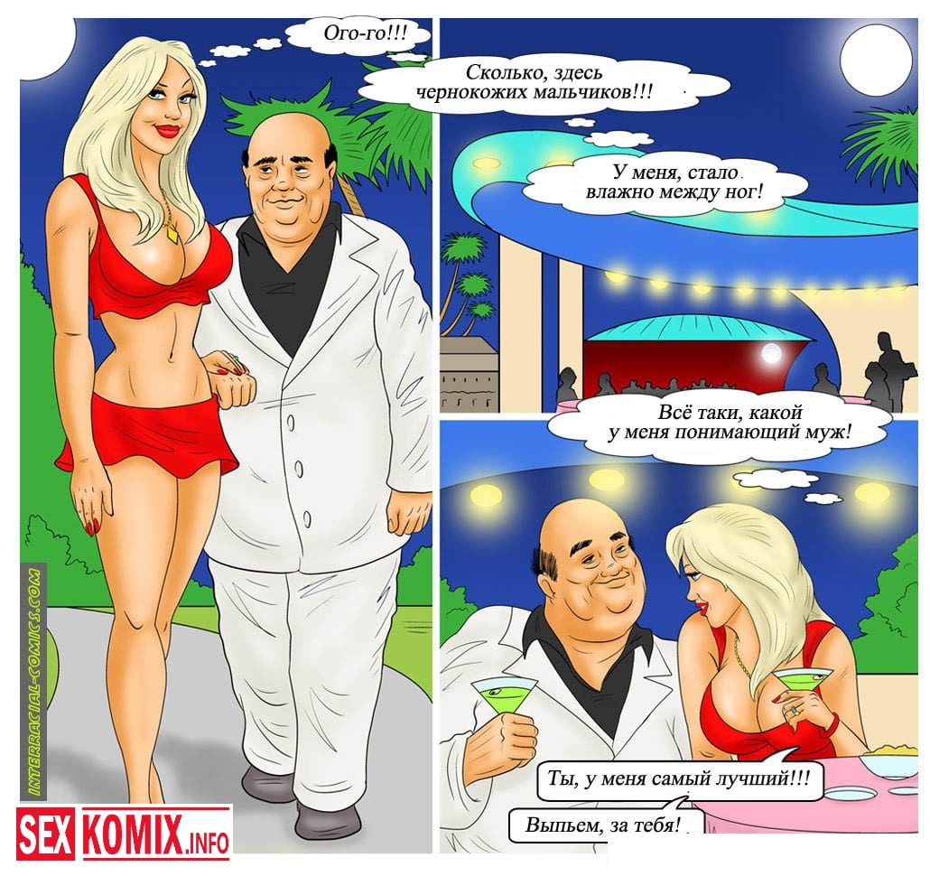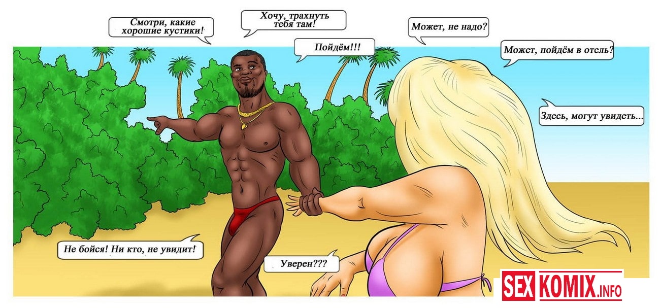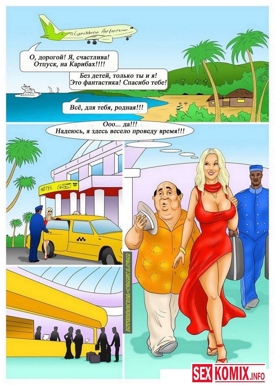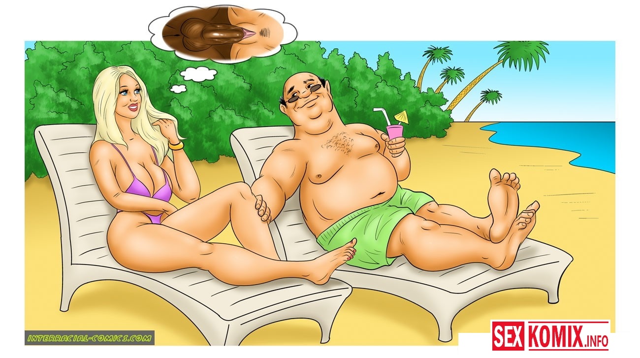 Порно комикс Карибские каникулы. В этом комиксе, горячая блондинка приехала на отдых со своим мужем, но думает она о больших черных членах. И в первый же день начала заигрывать с чернокожим носильщиком, и соблазнив его, трахается в тайне от мужа во все дыры. На этом её приключения не заканчиваются.