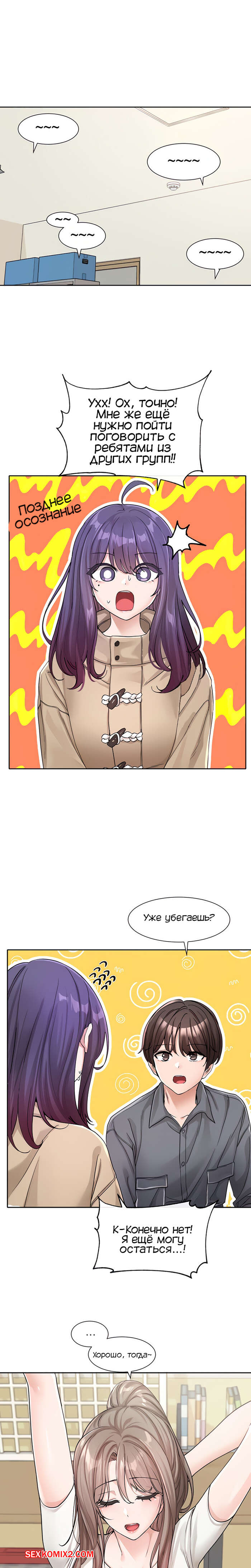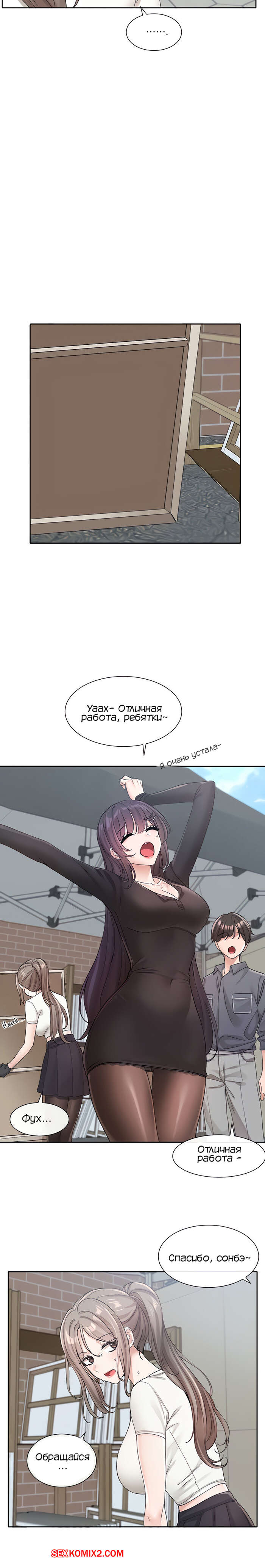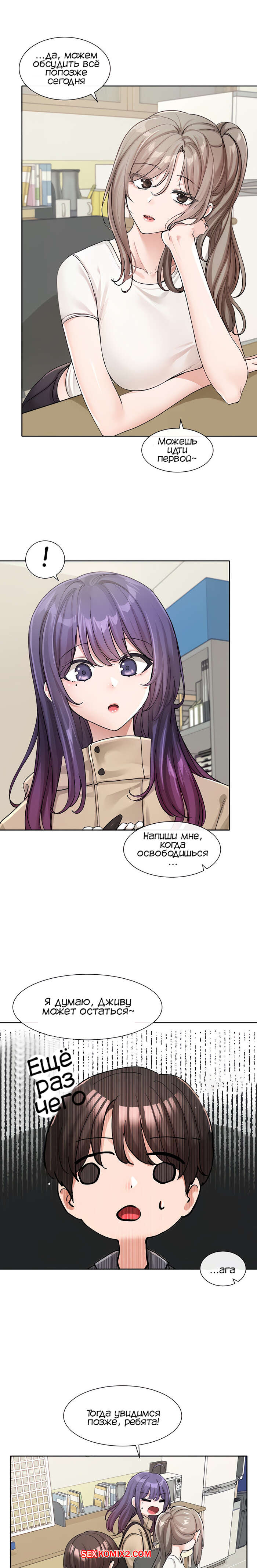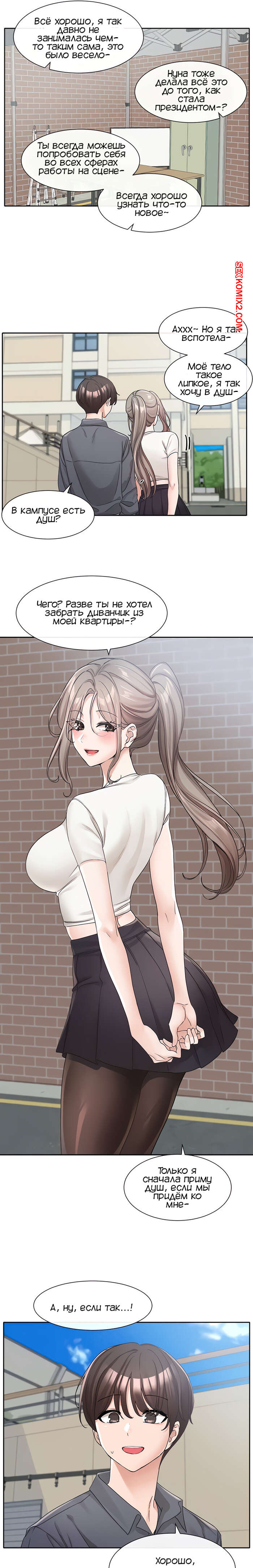 Порно комикс Театральный клуб. Часть 122. Circles. Theater cociety. После репетиции все разошли, остался только ГГ со своей подругой. Он тоже хотел уйти, но девушка его остановила, чтобы поговорить с ним. Парень начал попет после это начала разговора.