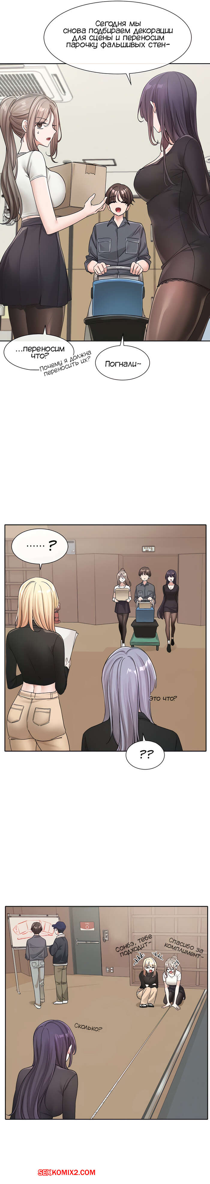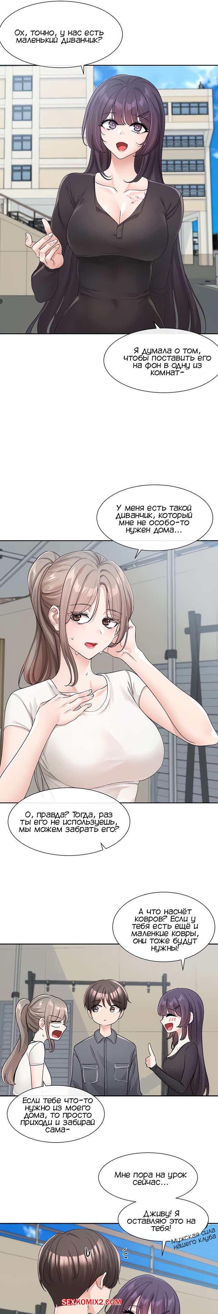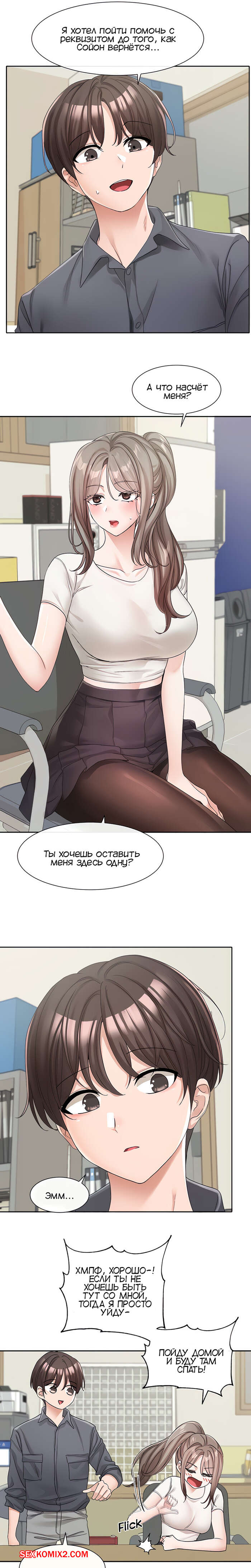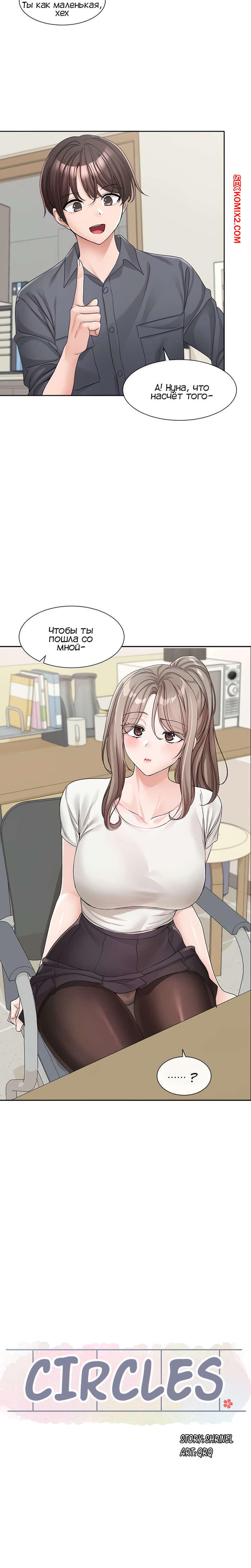 Порно комикс Театральный клуб. Часть 122. Circles. Theater cociety. После репетиции все разошли, остался только ГГ со своей подругой. Он тоже хотел уйти, но девушка его остановила, чтобы поговорить с ним. Парень начал попет после это начала разговора.