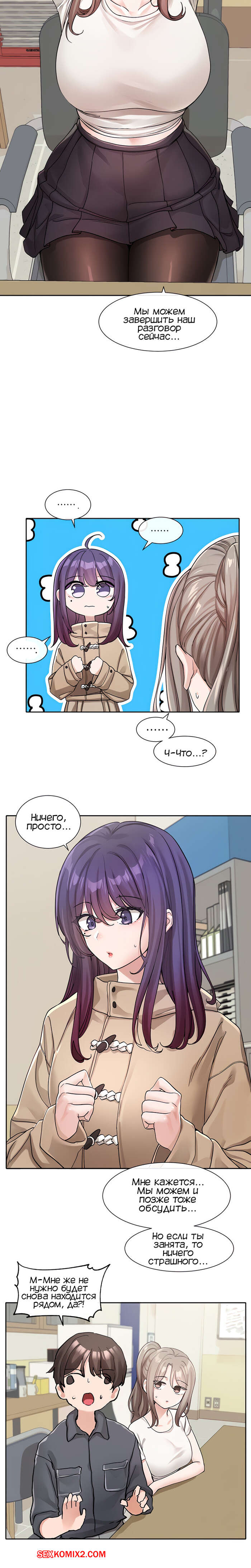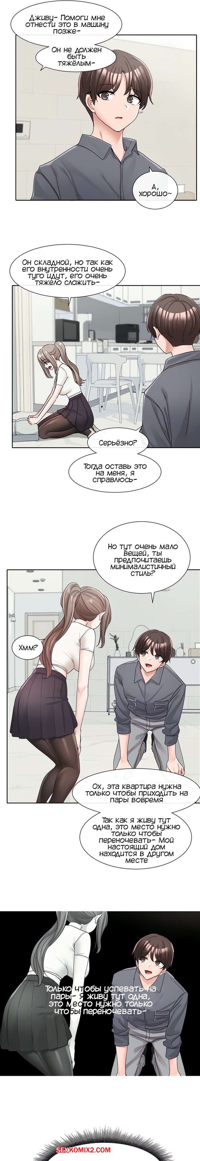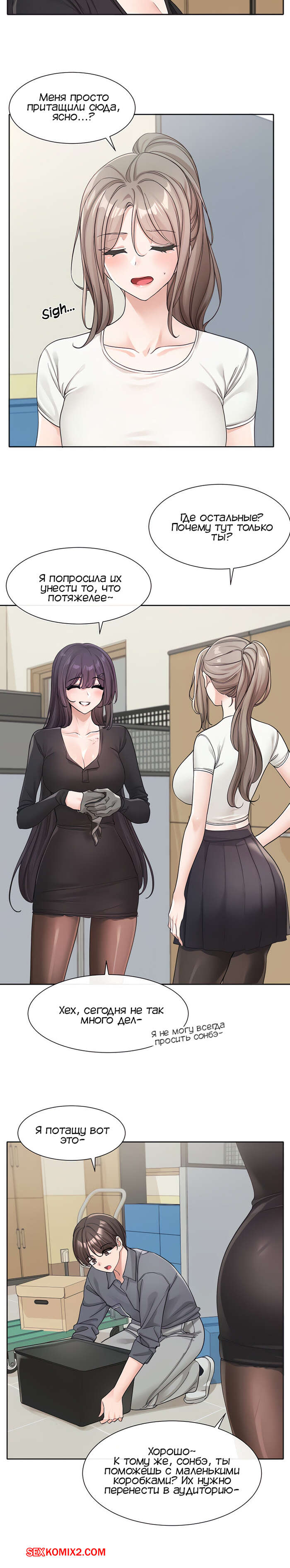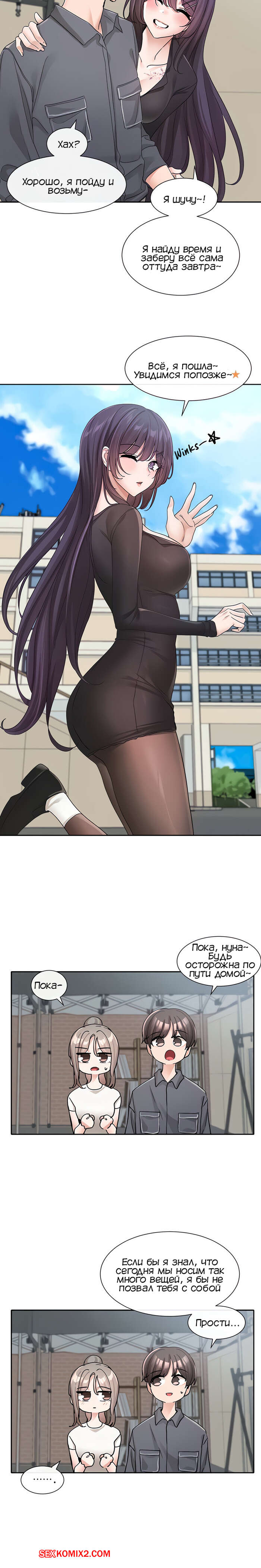 Порно комикс Театральный клуб. Часть 122. Circles. Theater cociety. После репетиции все разошли, остался только ГГ со своей подругой. Он тоже хотел уйти, но девушка его остановила, чтобы поговорить с ним. Парень начал попет после это начала разговора.