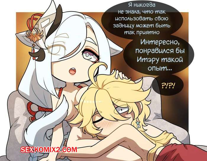 Порно комикс Genshin Impact. Шень Хэ х Итэр. kinkymation Сексуальная блондинка была очень возбуждена и решила повеселиться со своим дружком. Она разделась и возбудила его своим шикарным телом, после чего дала ему выебать себя в задницу.