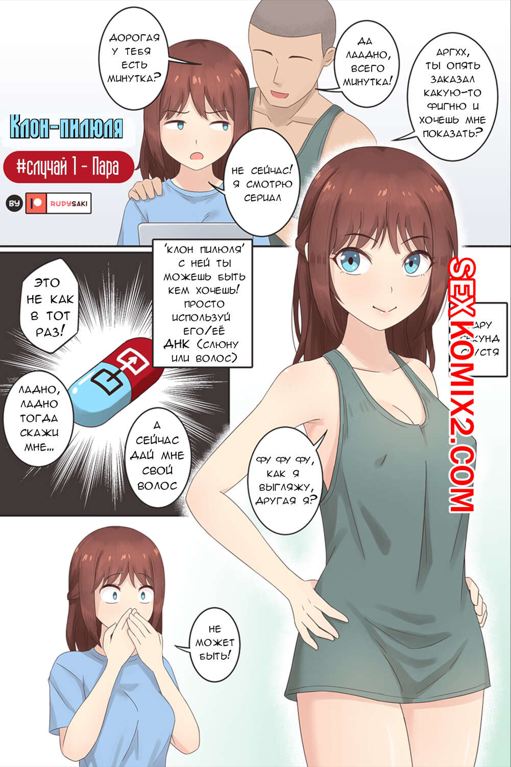 Порно комикс Клон пилюля. Случай 1. Пара. RudySaki Парень с девушкой приобрели необычную пилюлю. С его помощью парень превратился в свою любимую, после чего они занялись страстной лесбийской еблей, получив огромное удовольствие.