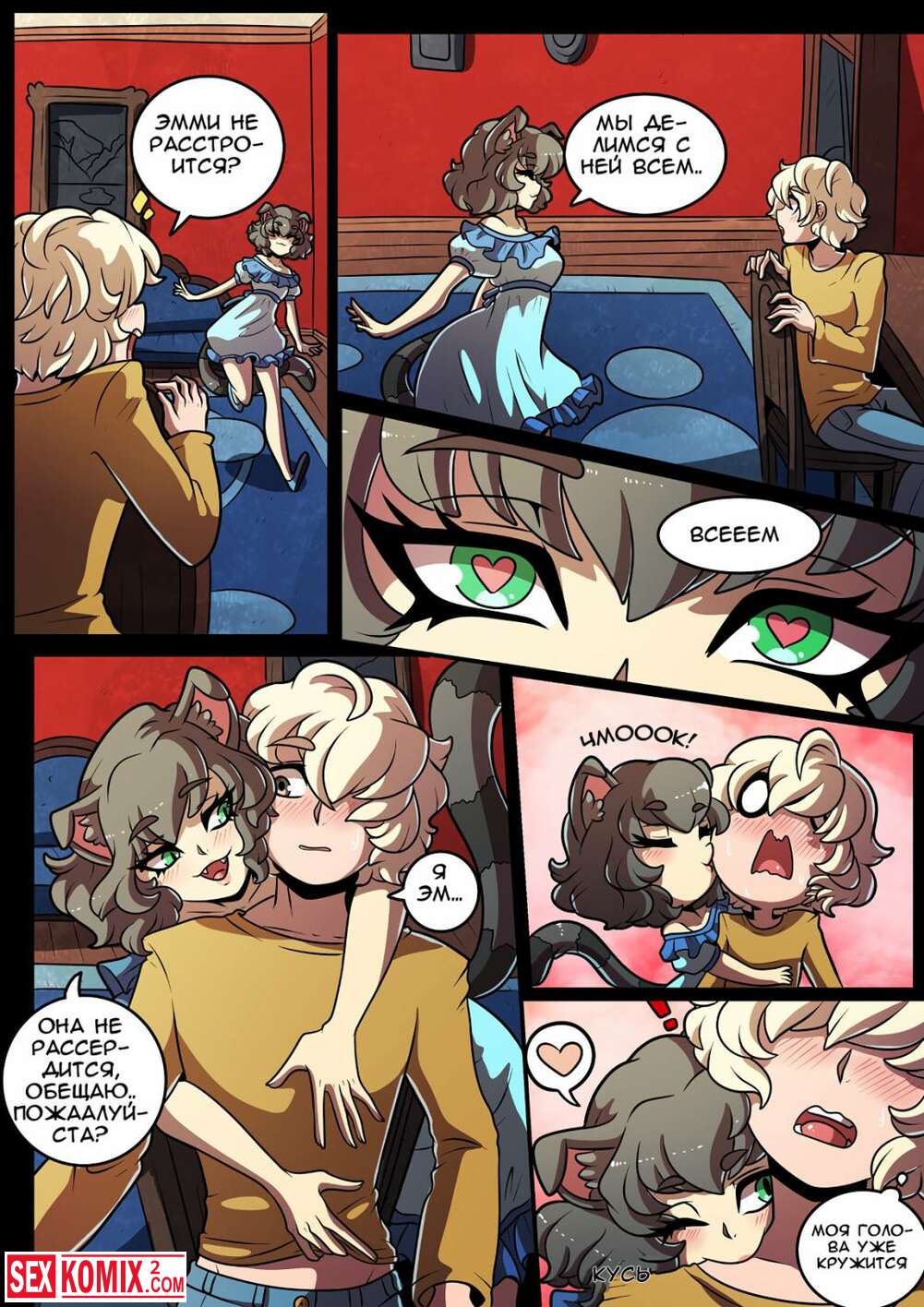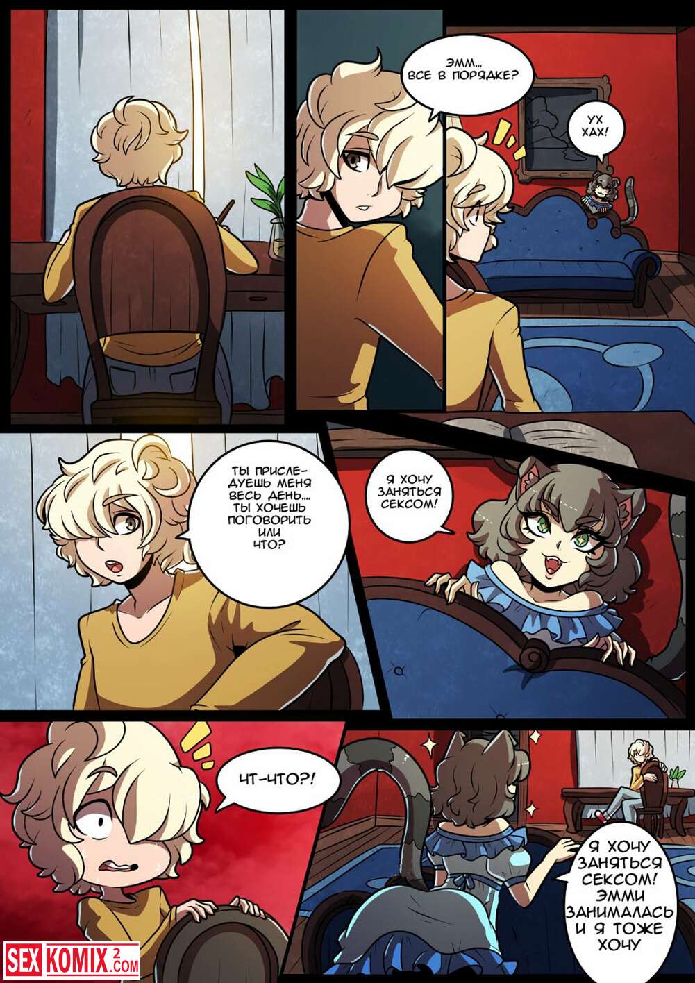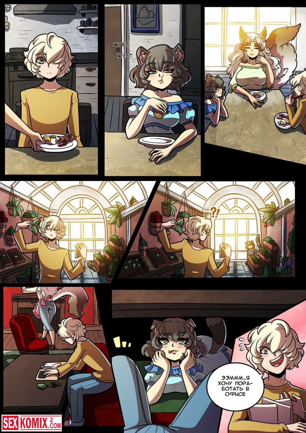 Порно комикс Кошачий замок. Часть 2. Feline Chateau. Проснувшись утром, парень насладился моментом от воспоминаний прошлой жаркой ночи, но не прошли и минуты как его обняла ещё одна симпатичная кошечка.