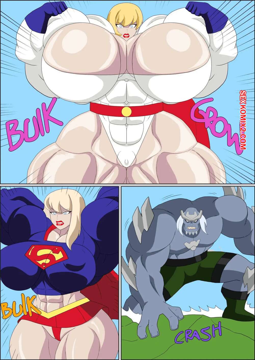 Порно комикс Power Girl. Zetarok Супермен на время покинул Землю и доверил Землю двум сексуальным красоткам. Девушки вступили в сражение со злодейкими, в результате чего их тела изменились, а их формы увеличились.