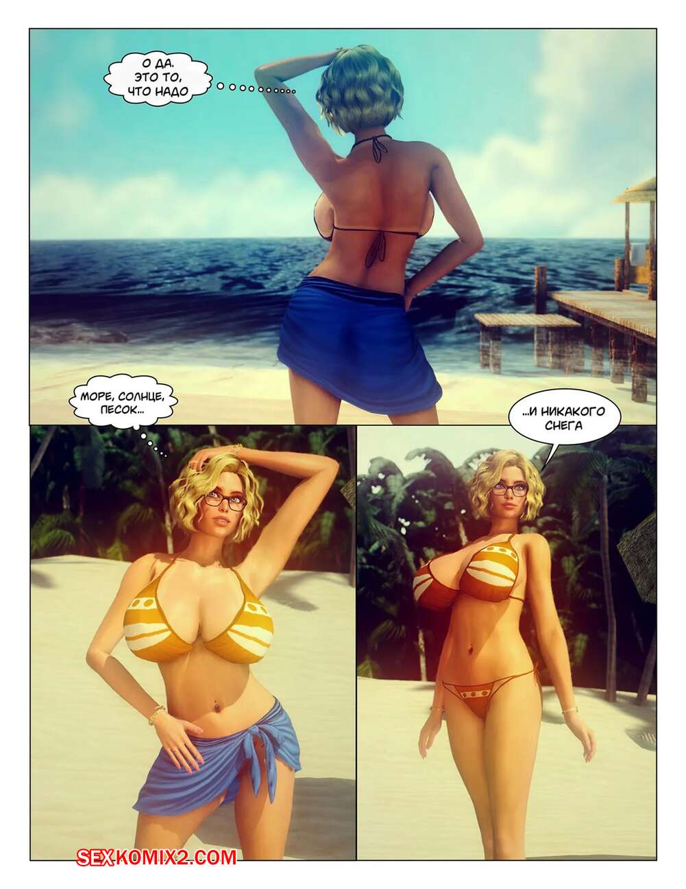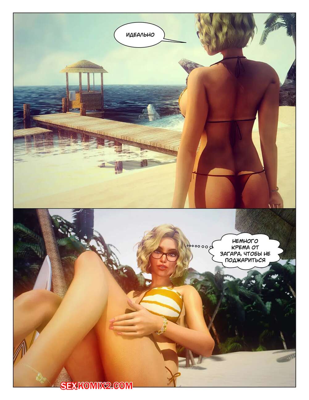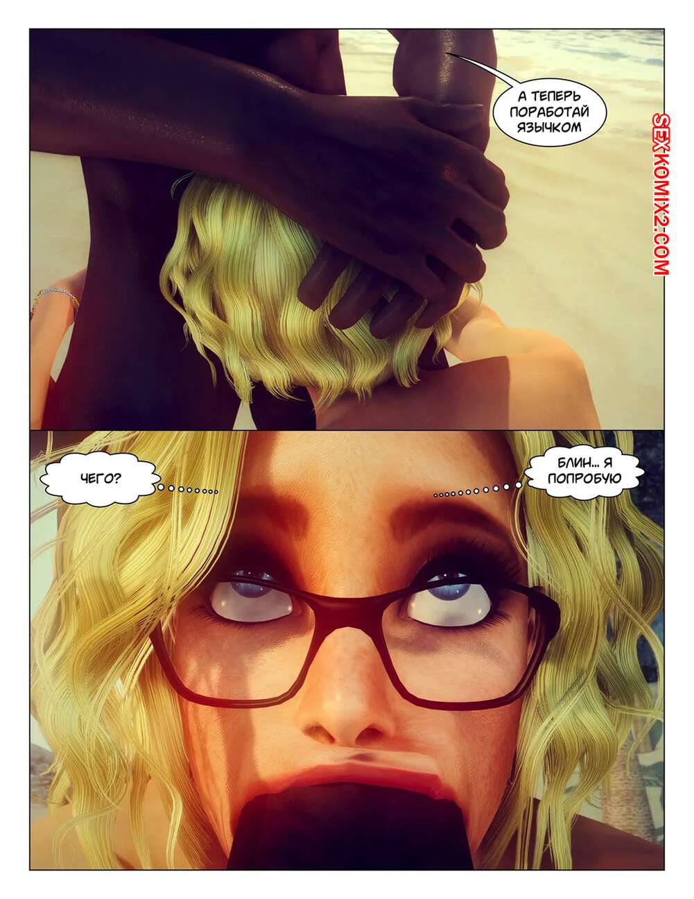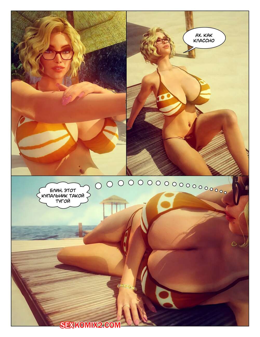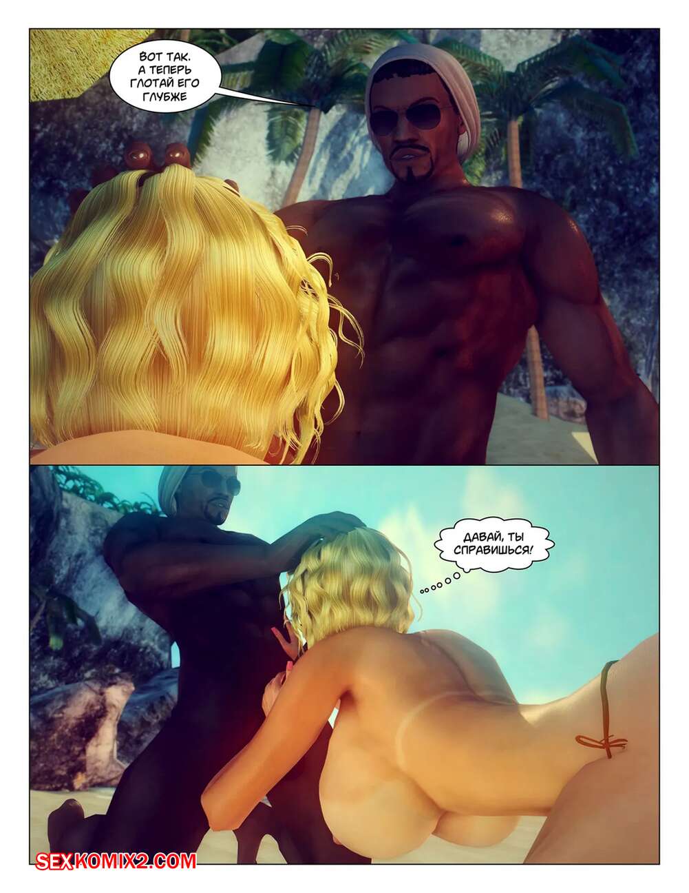 Порно комикс Тропические фантазии. Tropical Fantasy Сексуальная блондинка пришла на пляж, чтобы позагорать топлес. Там красотка привлекла внимание темнокожего парня, который дал девушке отсосать свой большой хуй и выебал ее пизденку.
