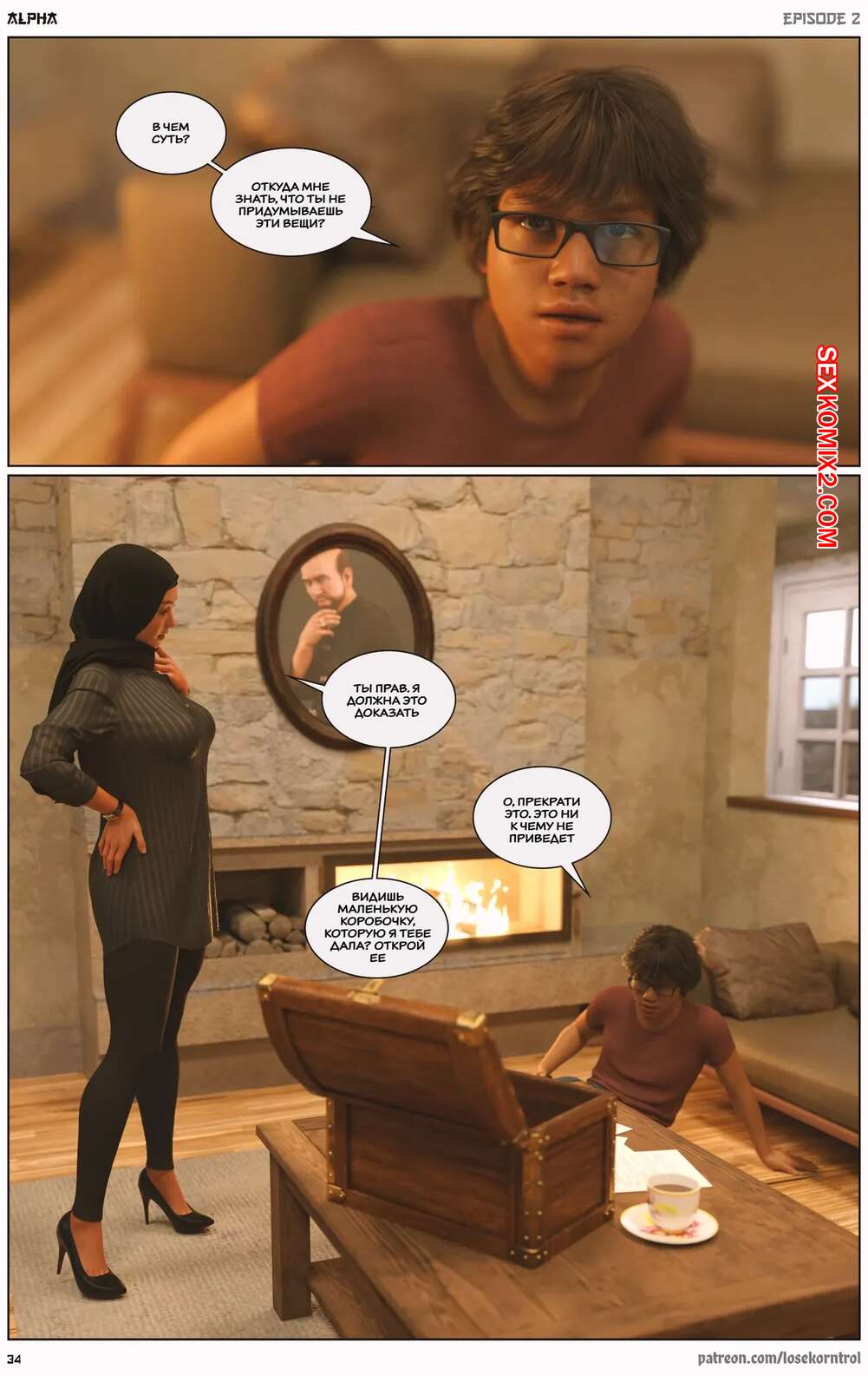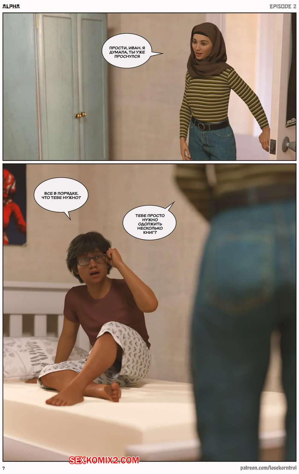 Порно комикс Альфа. Часть 2. Alpha. LoseKorntrol, Hijab3DX Горячая брюнетка милфа пригласила к себе молодого парня. Он стал представлять ее голой и вскоре увидел красотку в одних трусиках, а ее соски были скрыты от его взгляда.