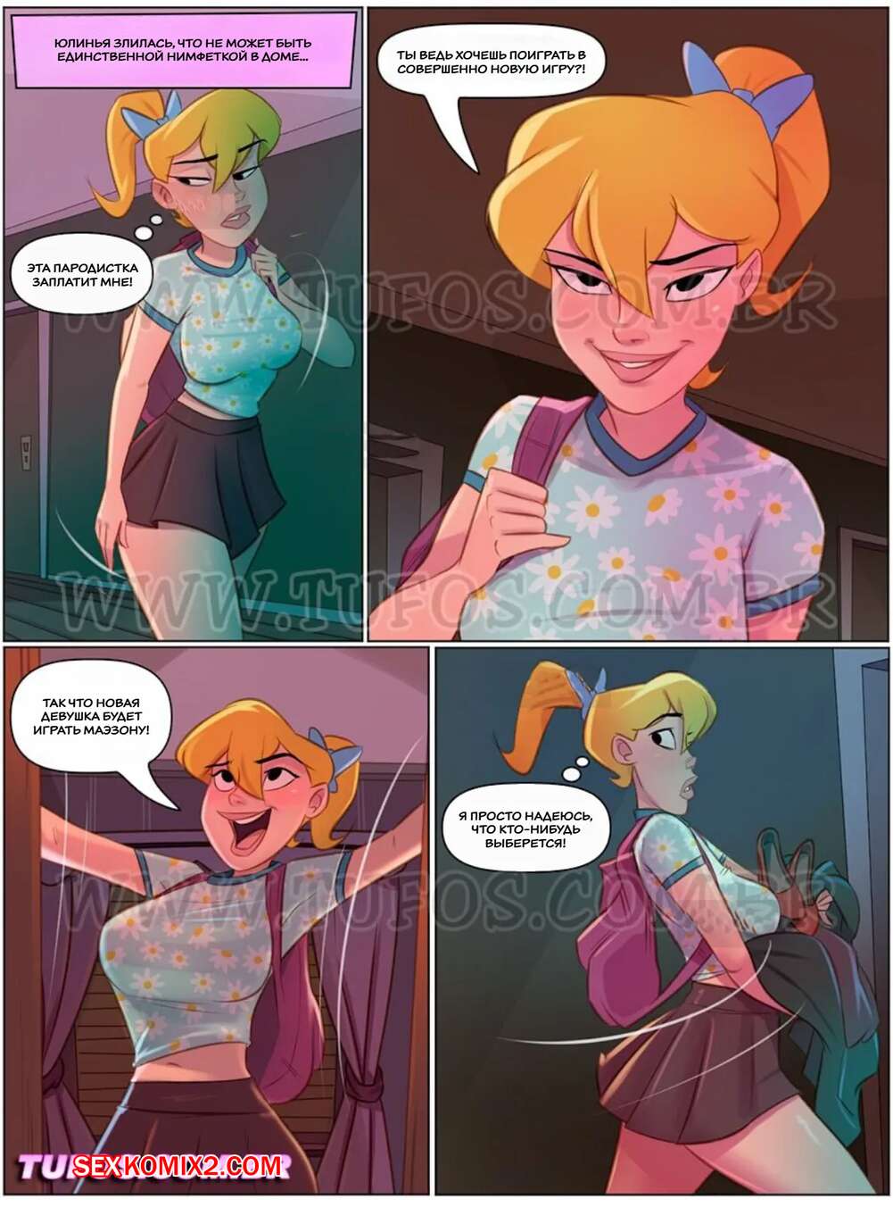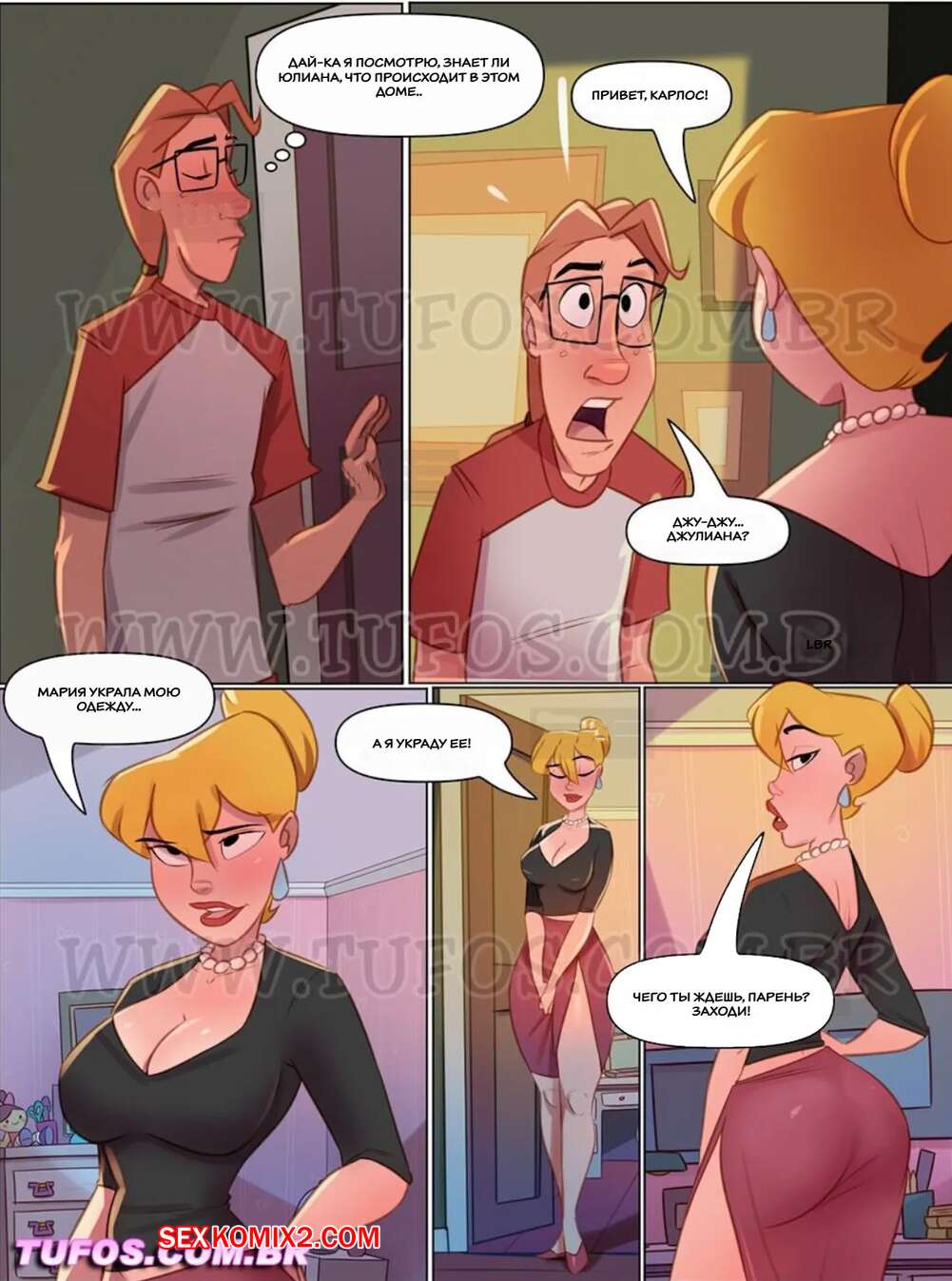 Порно комикс Четверо похотливых. Часть 9. As 4 sacanas. Tufos. Горячая блондинка с сочным телом соблазнила парня, дала пососать свои сиськи и села на его стоящий хуй.