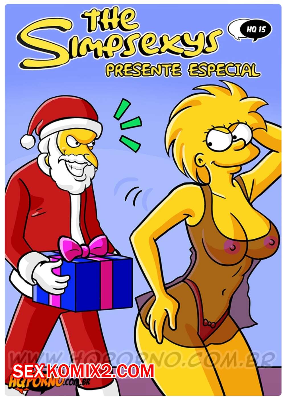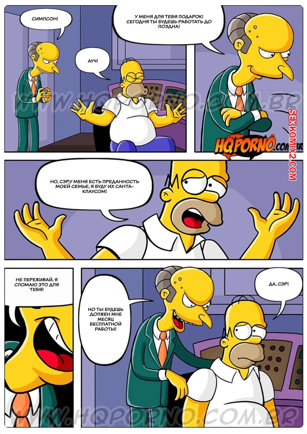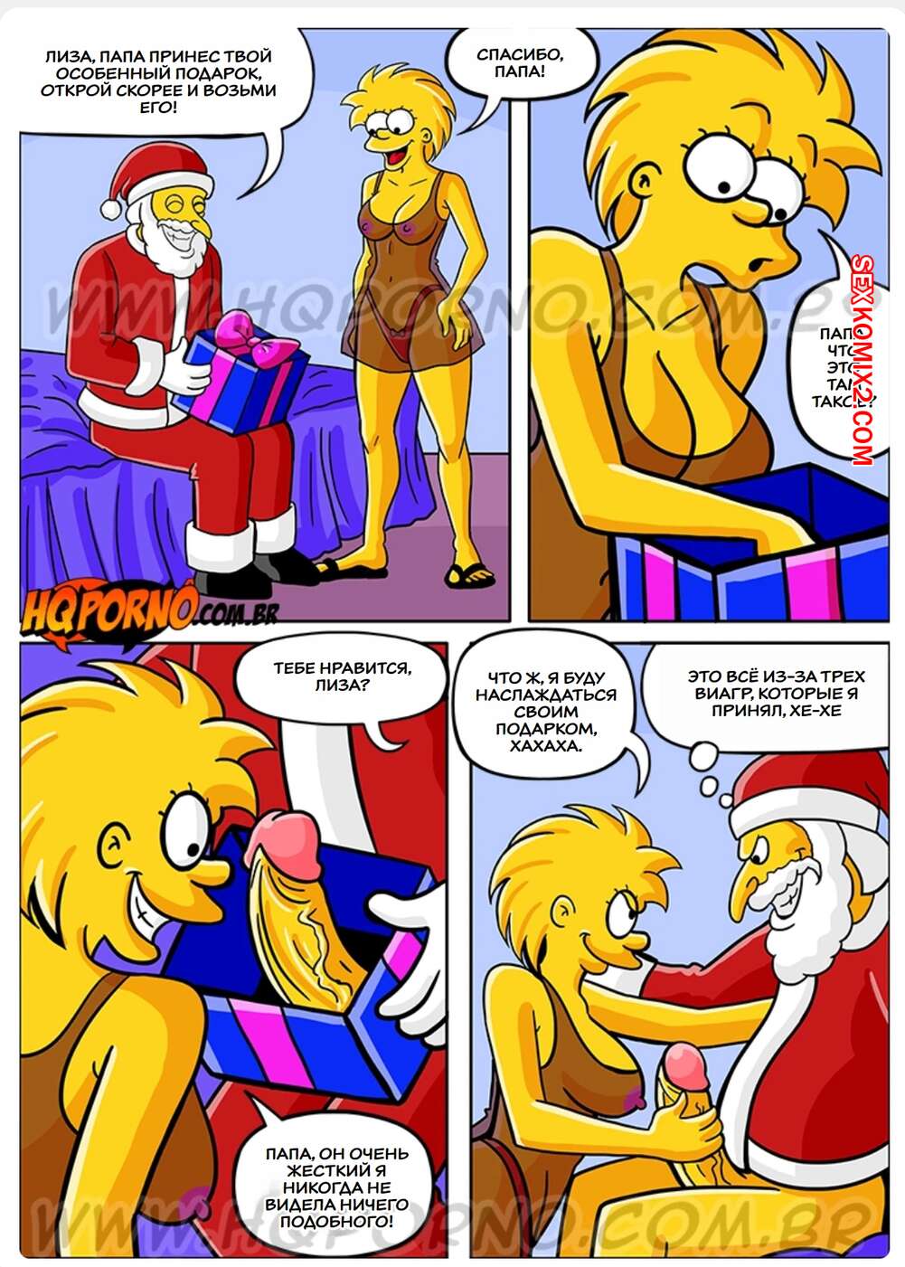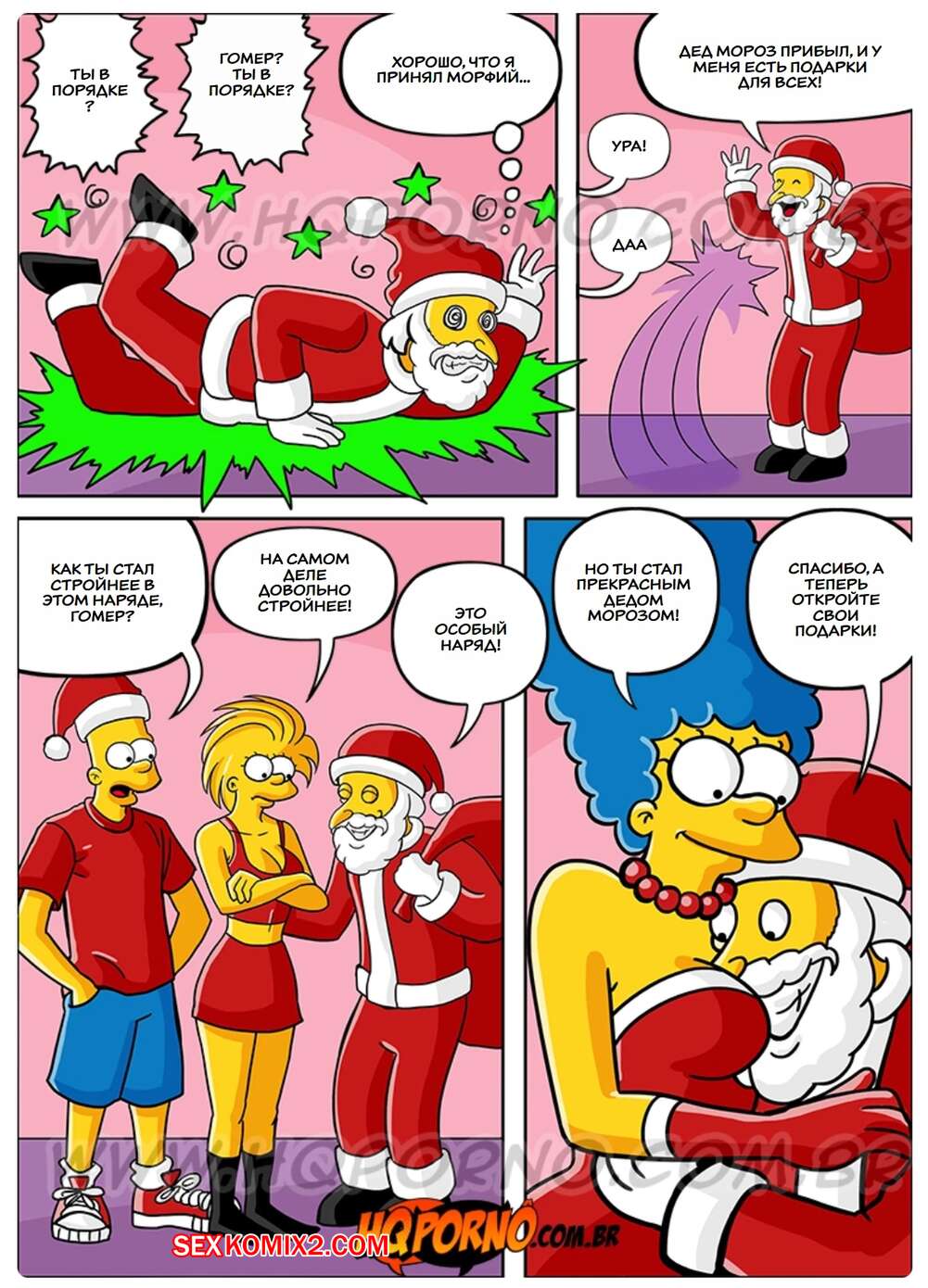 Порно комикс Симпсексы. Часть 17. Os Simpsexys. HQPorno Босс Гомера надел костюм Санты и отправился домой к его семье. Он сделал подарок дочери Гомера, а она позвала его в спальню, чтобы отблагодарить его и заняться сексом.