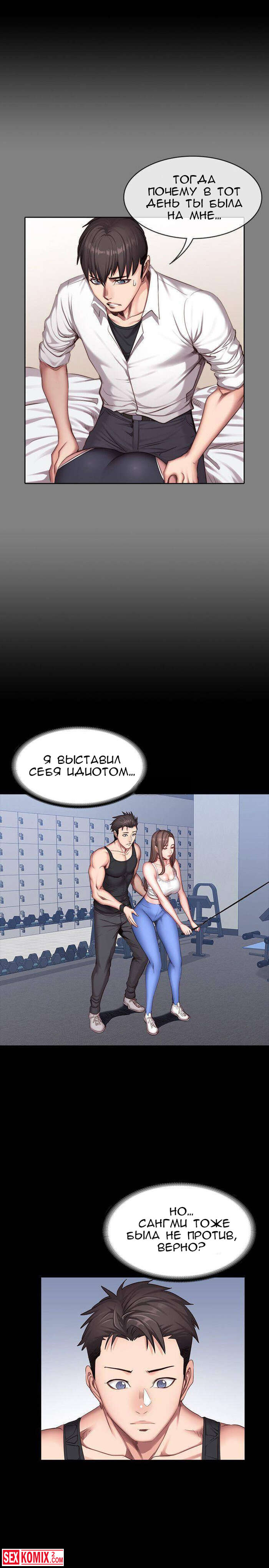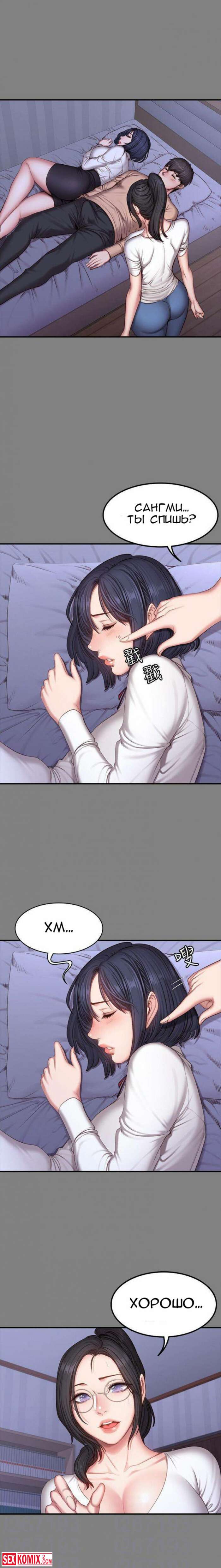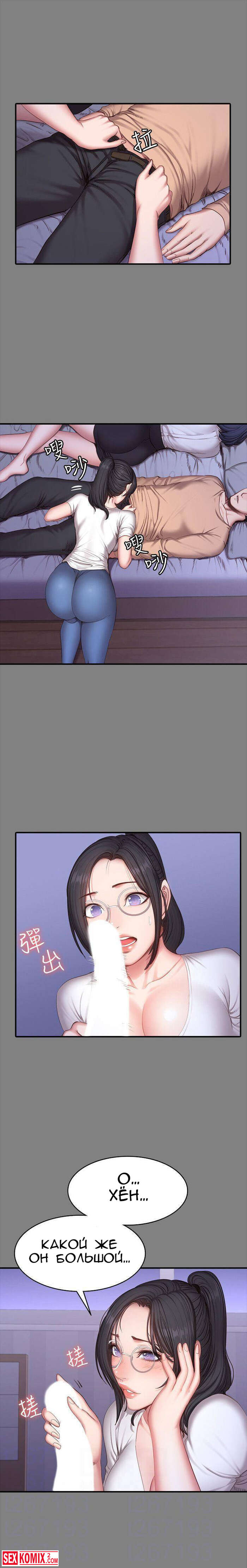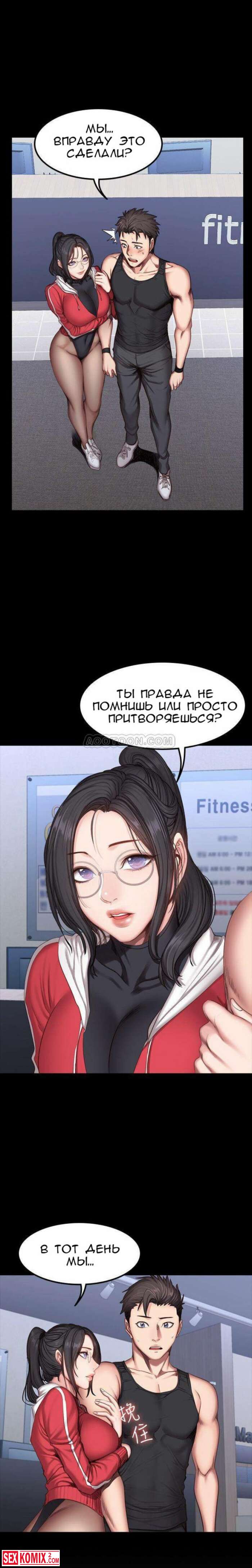 Порно комикс Фитнес. Части 26 и 27. Пока парень спал, брюнетка сняла с него штаны и сделал минет. Её не остановила его девушка, которая лежала рядом.