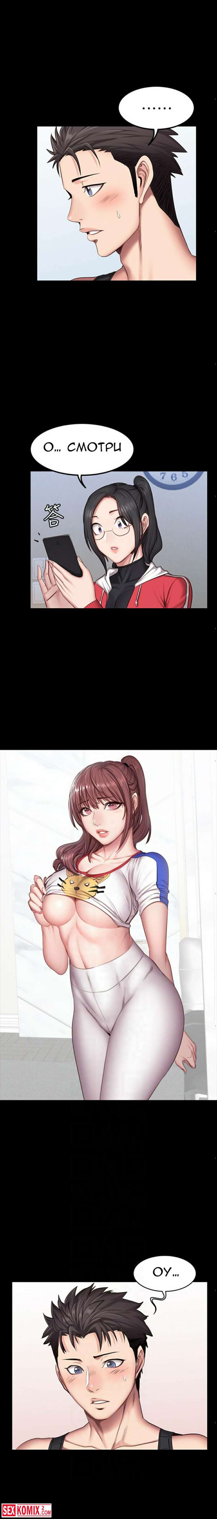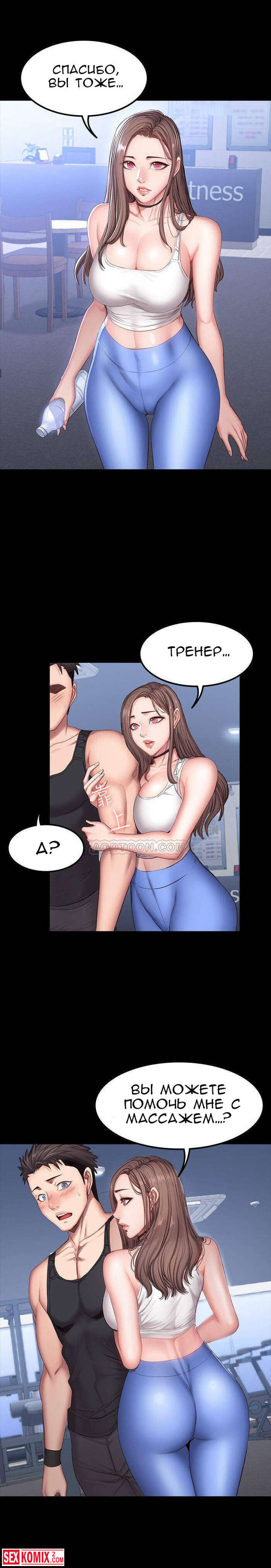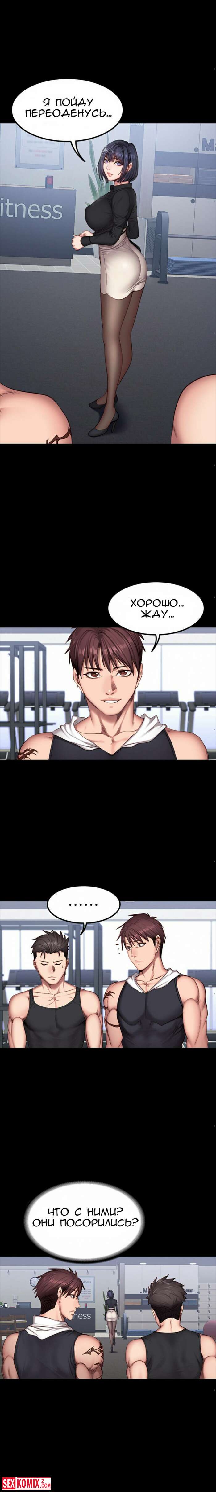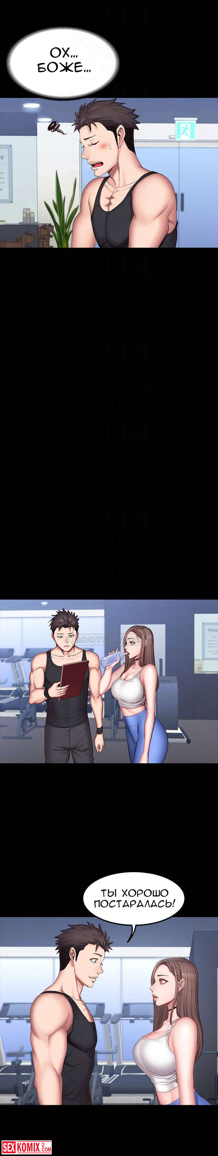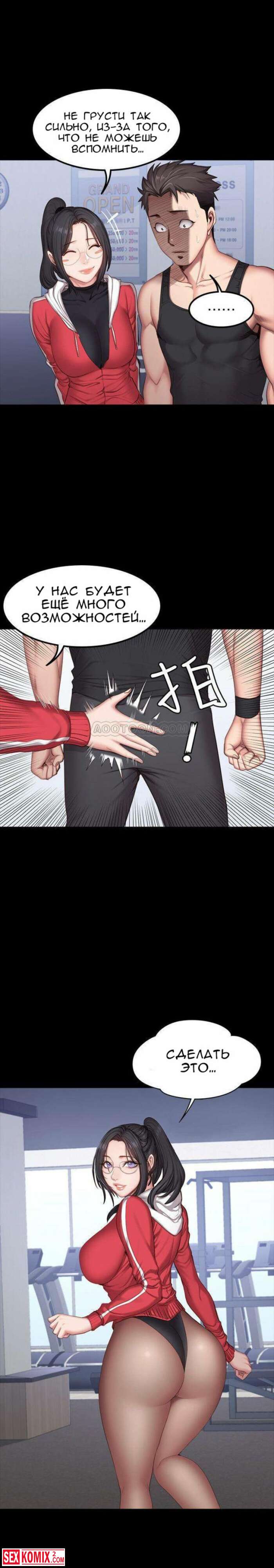 Порно комикс Фитнес. Части 26 и 27. Пока парень спал, брюнетка сняла с него штаны и сделал минет. Её не остановила его девушка, которая лежала рядом.