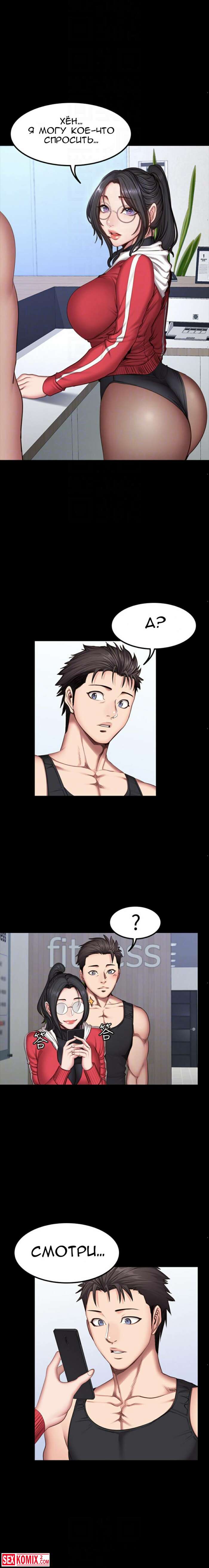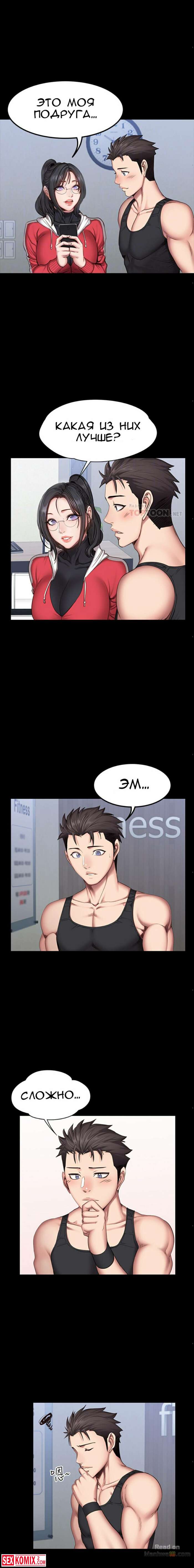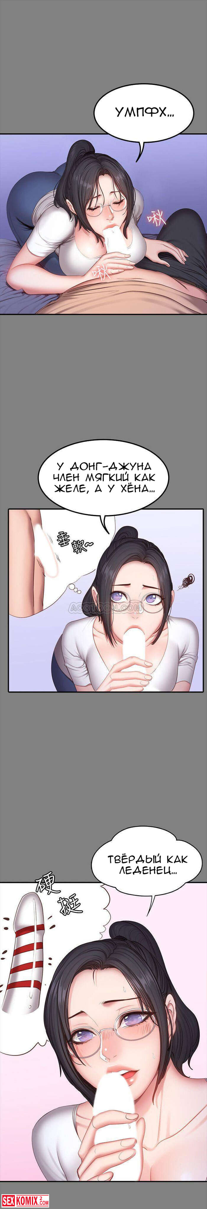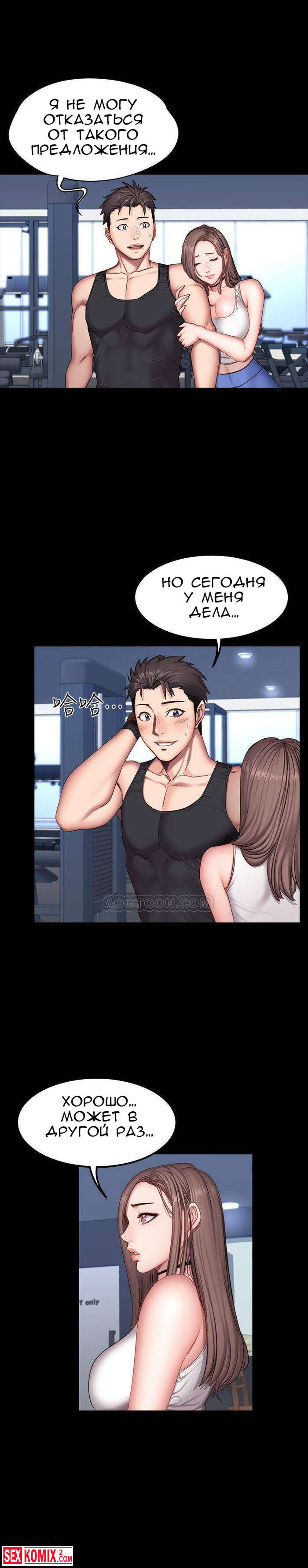 Порно комикс Фитнес. Части 26 и 27. Пока парень спал, брюнетка сняла с него штаны и сделал минет. Её не остановила его девушка, которая лежала рядом.