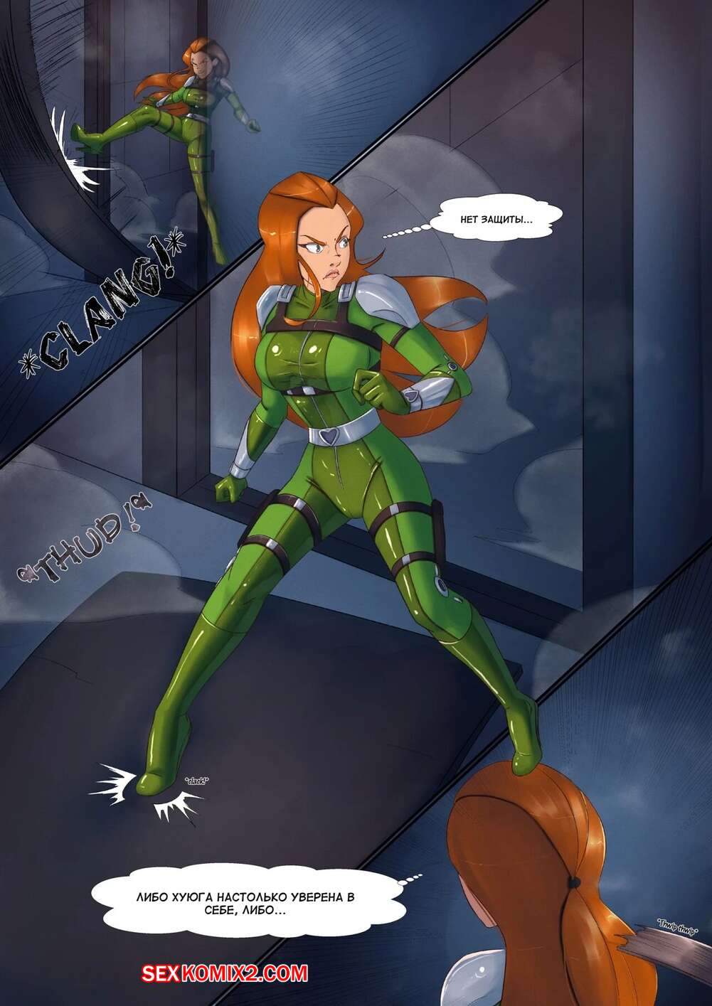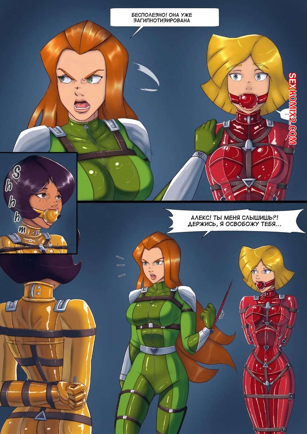 Порно комикс Тотали Спайс. Падение Сэм. Sams Downfall Горячая рыжая красотка Сэм отправилась спасать своих подруг. Ее схватила и связала сексуальная брюнетка, которая хорошенько выебала пизденку супершпионки с помощью страпона.