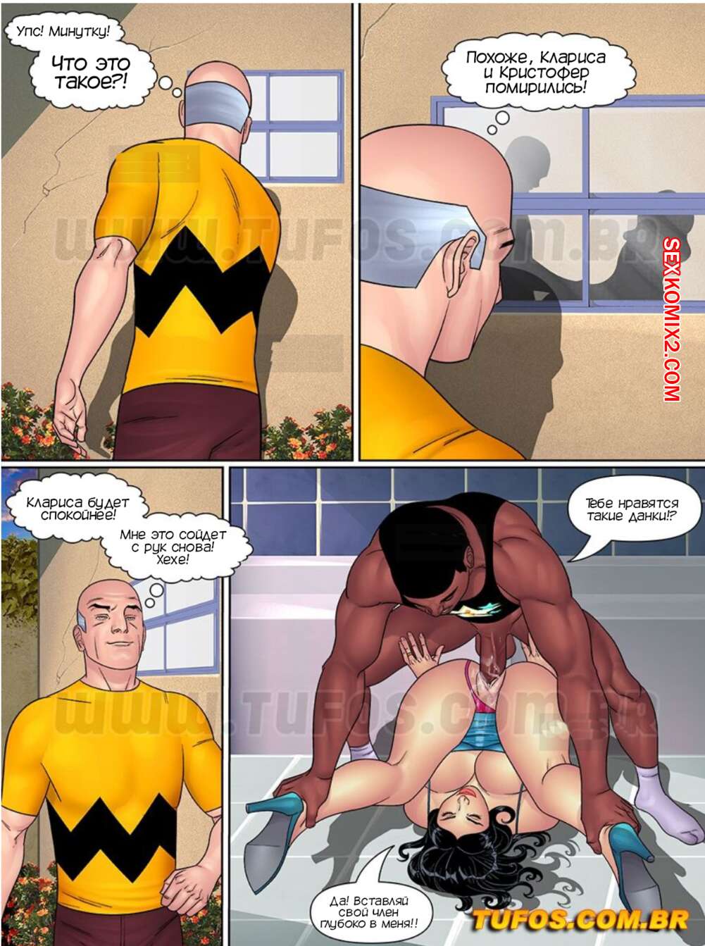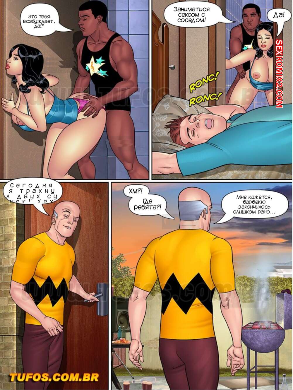 Порно комикс Папочка. Тесть извращенец. Барбекю с пагодой. Часть 7. Tufos Сисястая милфа Клариса не смогла устоять перед соблазнами темнокожего парня. Красотка разделась и отсосала его большой хуй, после чего дала ему выебать свою пизденку и кончить на нее.