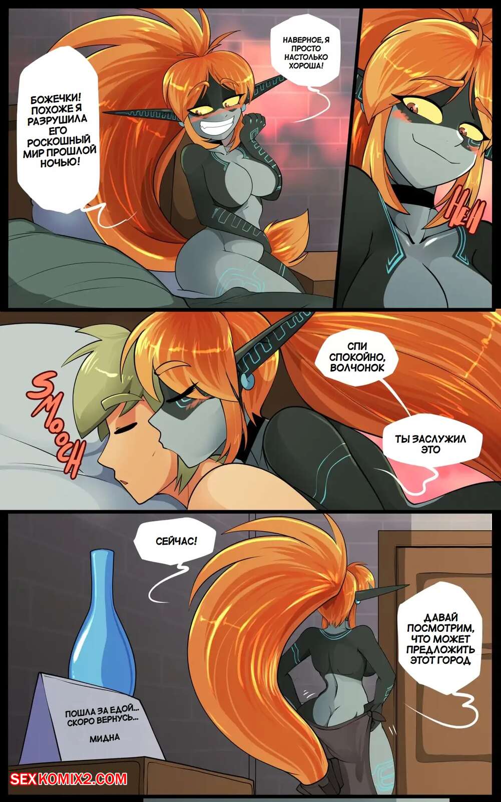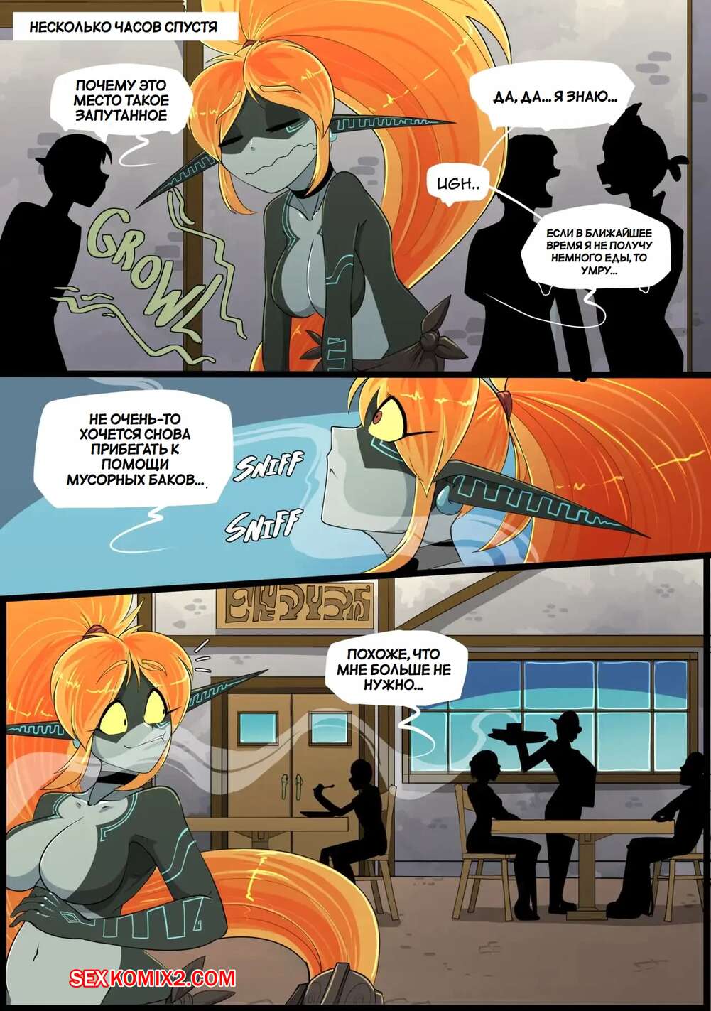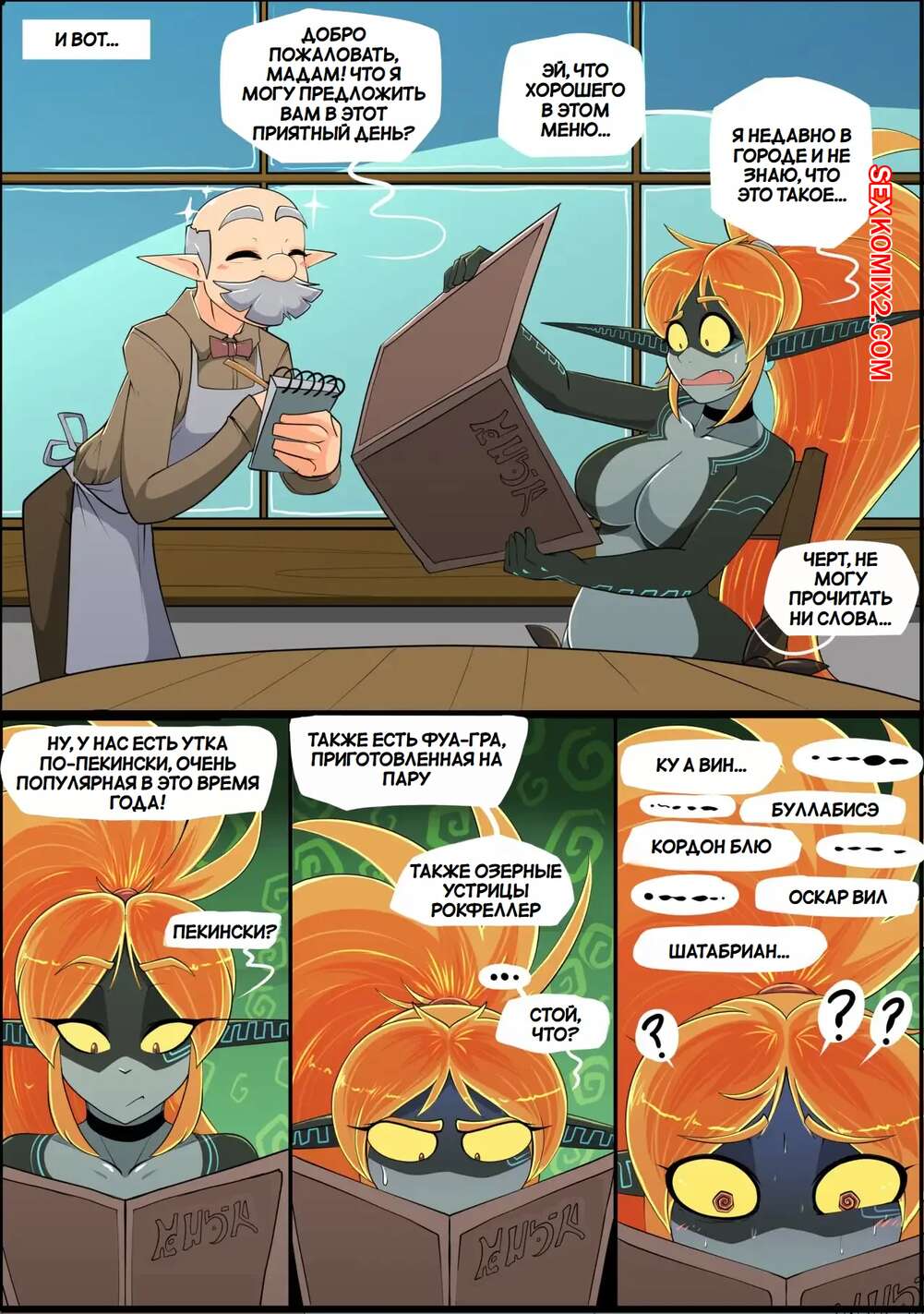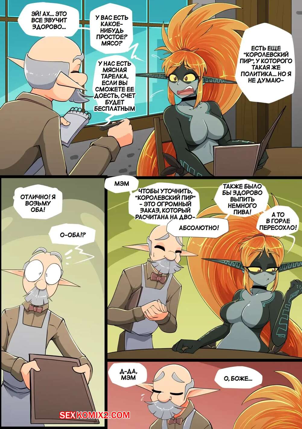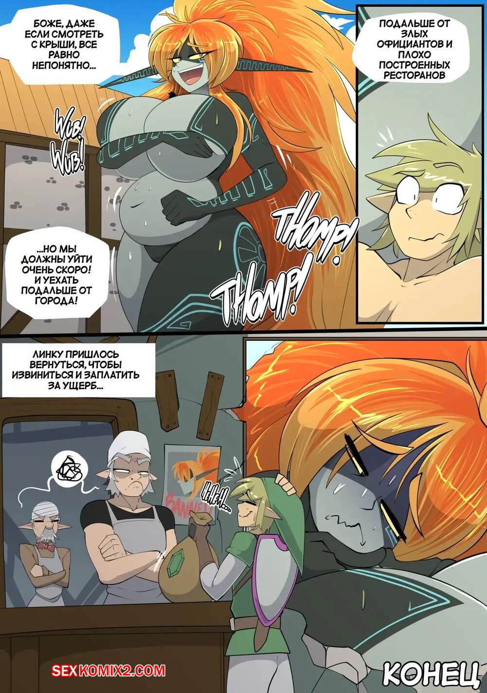Порно комикс Legend Zelda. Еда для Мидны. Meal for Midna. Vale city Горячая рыжая красотка была очень голодна и пошла в бар, чтобы перекусить. Девушка переела и ее тело начало меняться и стало огромным, а девушка возбудилась и стала ласкать себя.