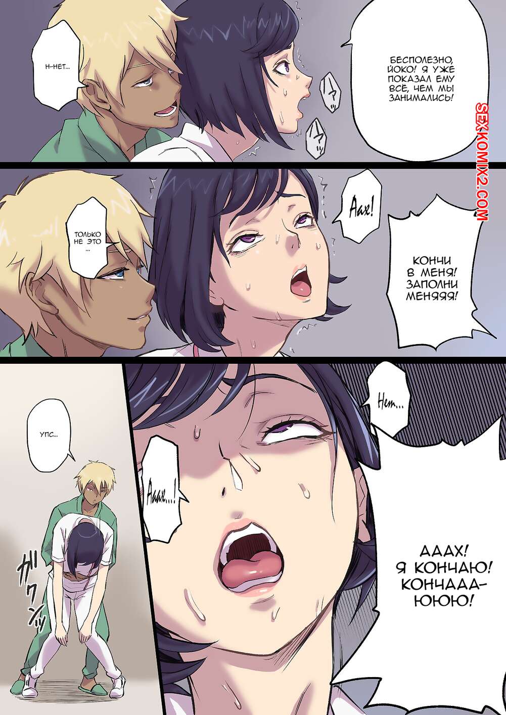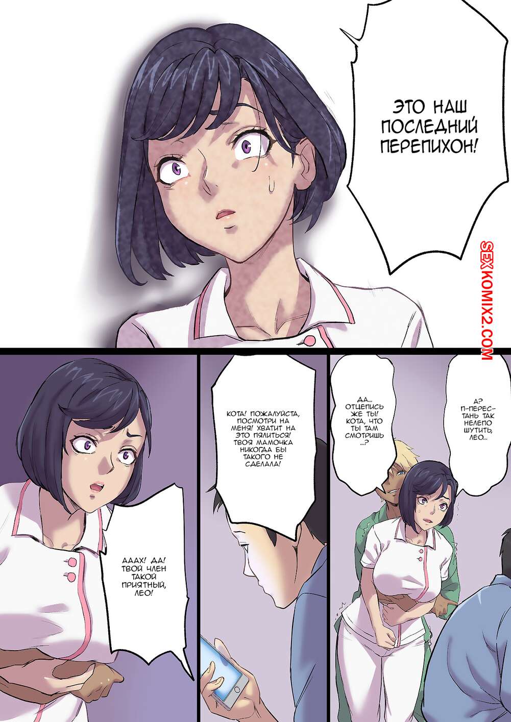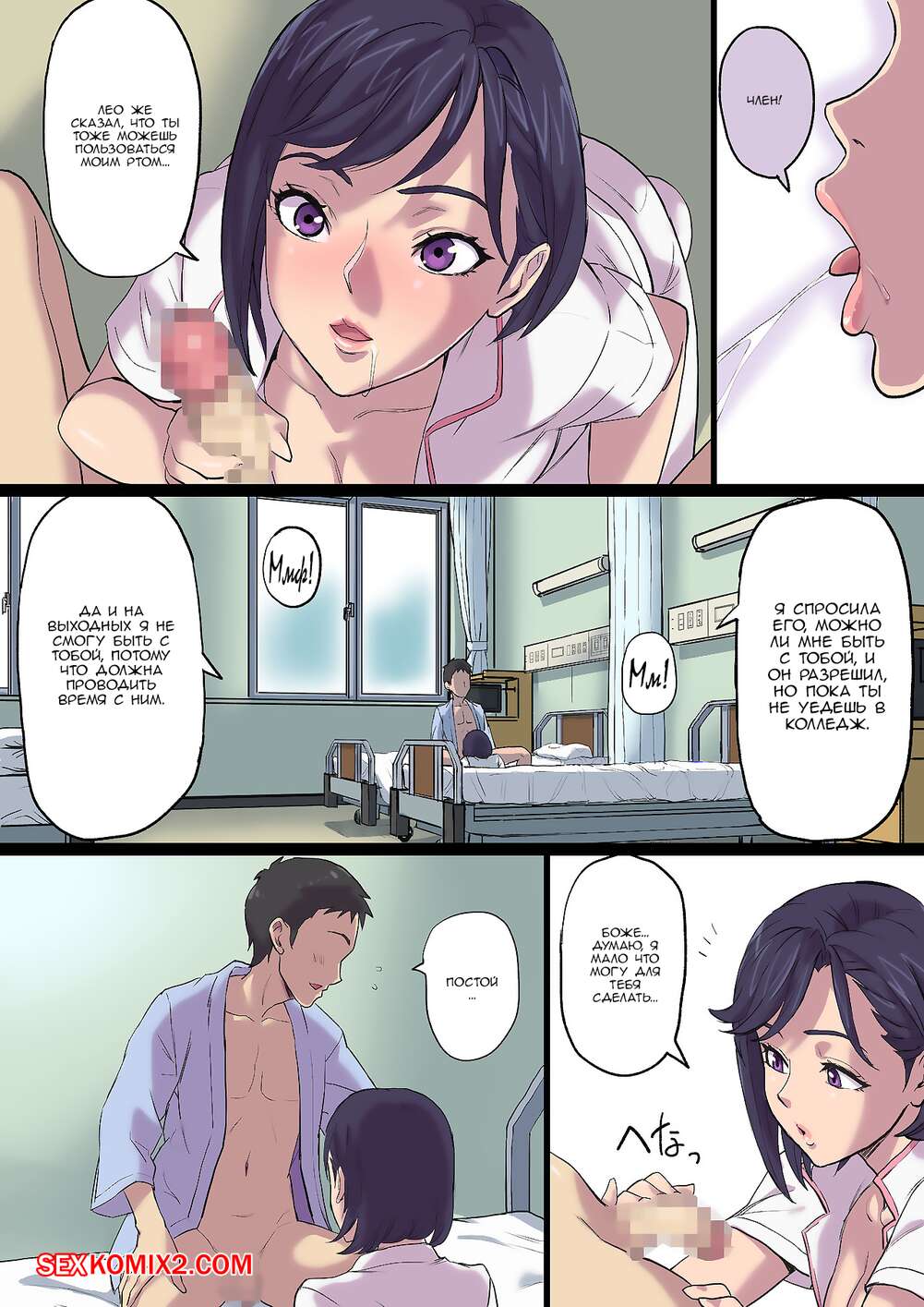 Порно комикс Milf Nurse Cuckolded on the bed next door. Часть 2. Shibire Hitsuji Горячая милфа медсестра без ума от большого члена своего пациента. Красотка раздевается и сосет большой хуй парня, после чего дает ему себя хорошенько выебать.