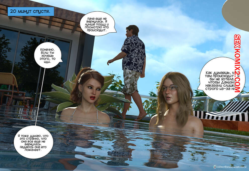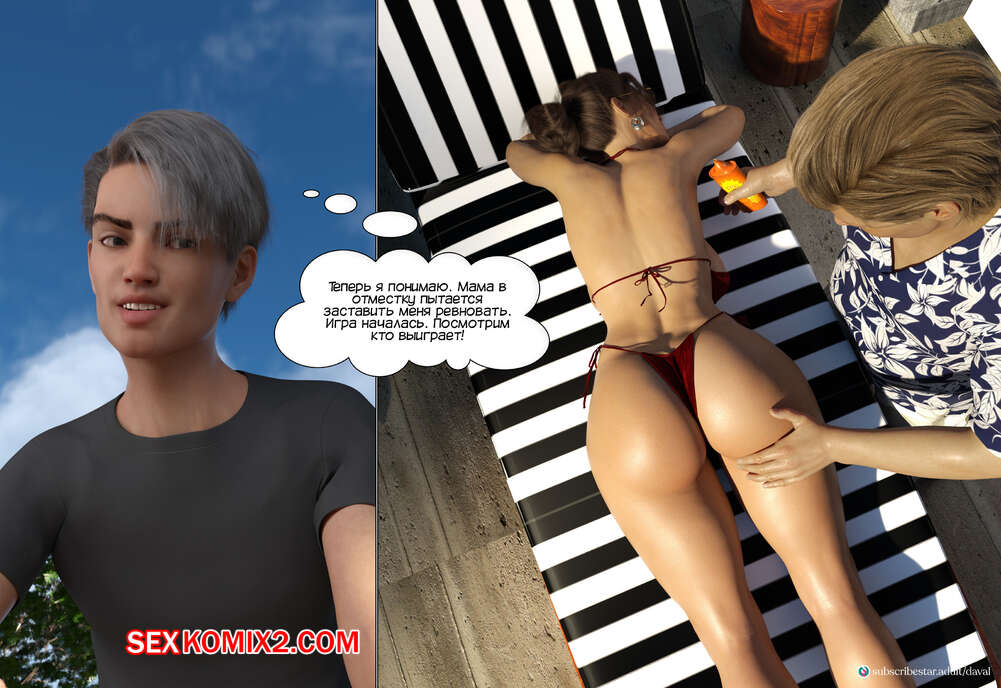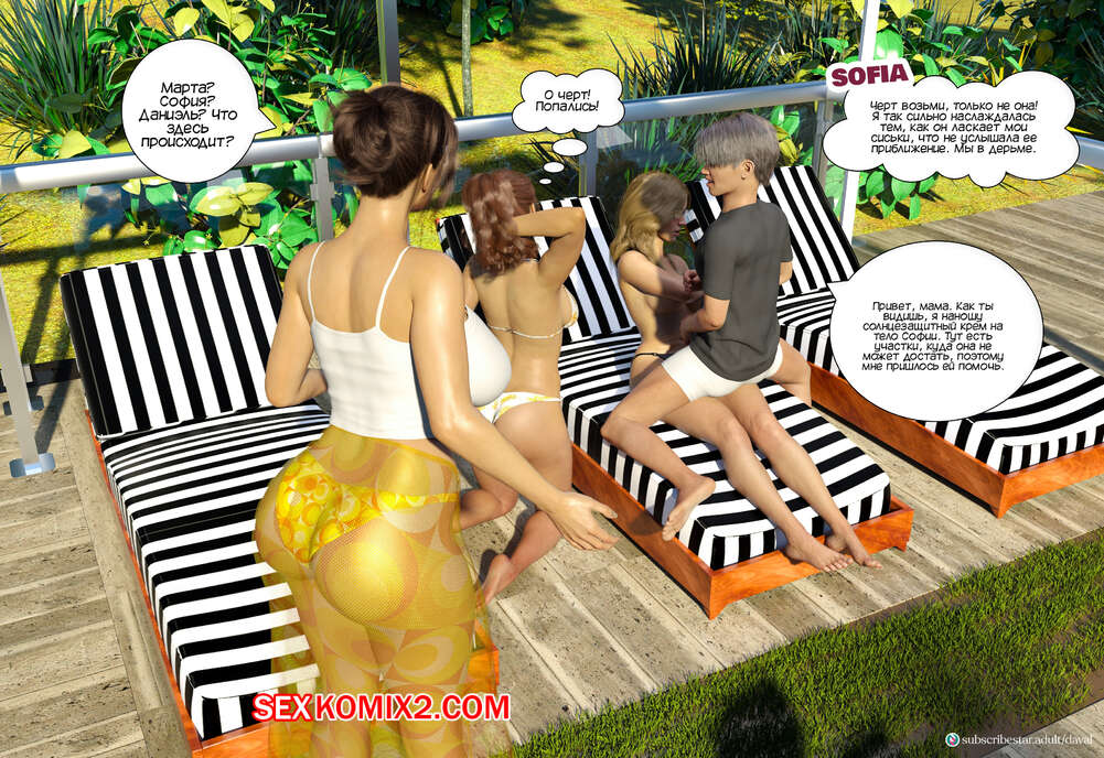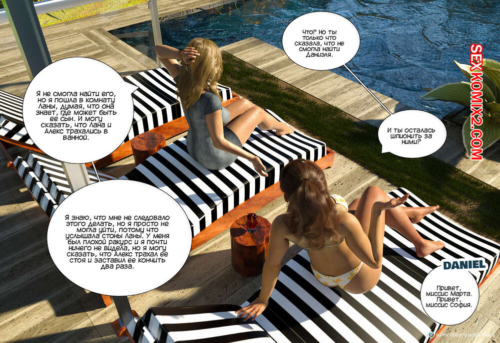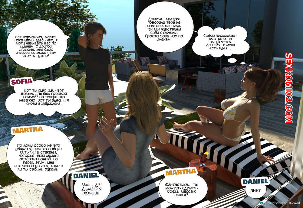 Порно комикс Непристойные желания мамаш. Часть 8. Immoral Desires. Daval3D София и Марта обсуждали у бассейна прошлую ночь и делили эмоциями, и там к ним присоединился Даниэль. Марта решила помочь подруге и попросила парня сделать ее массаж ножек.