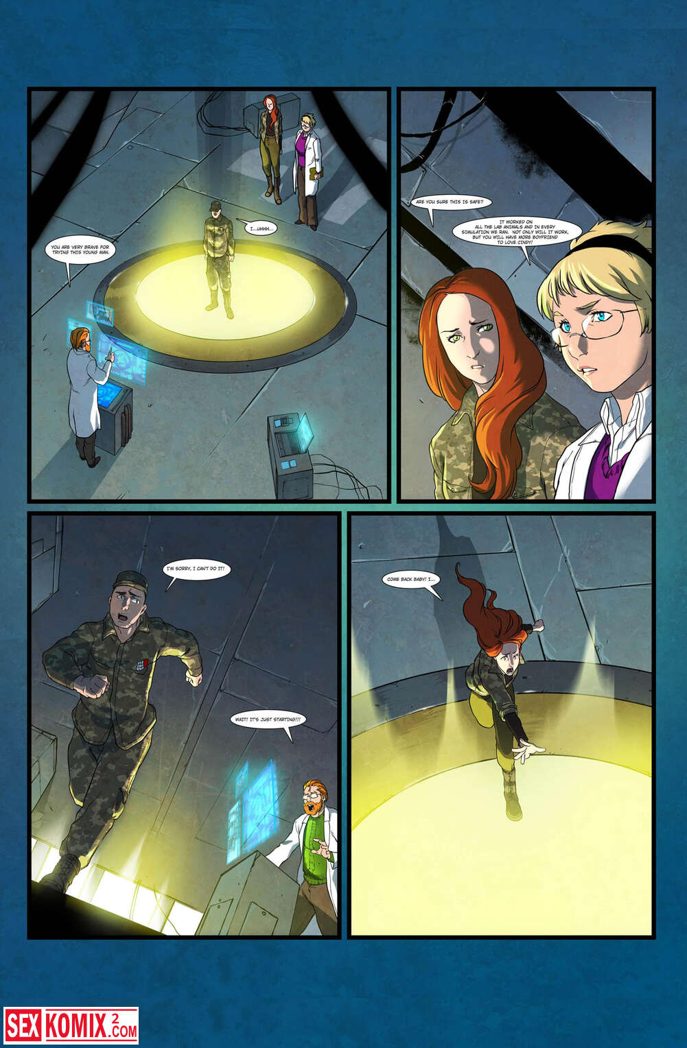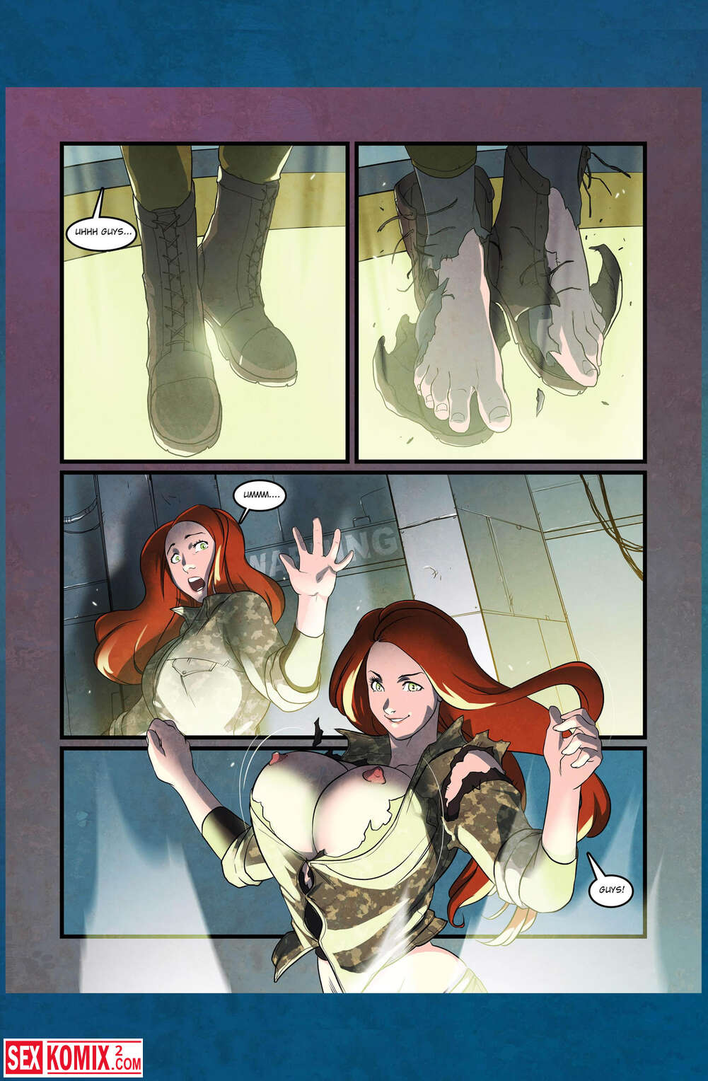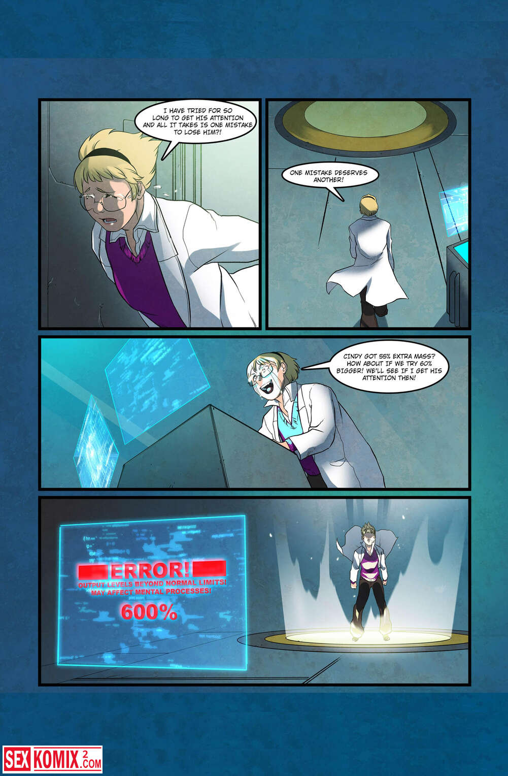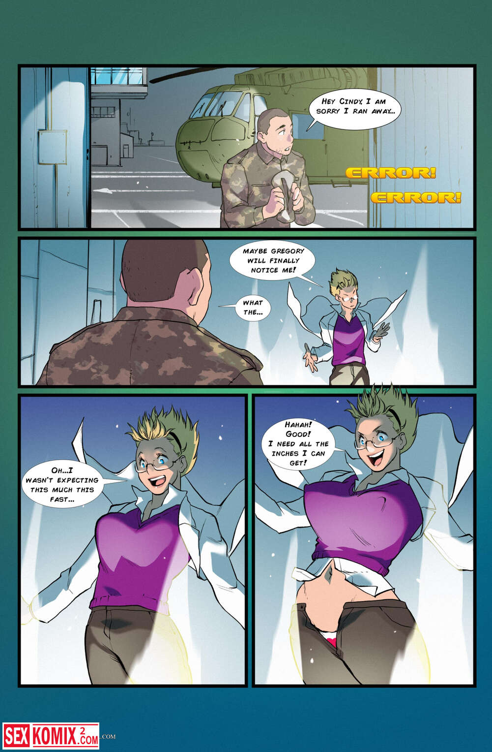 Порно комикс Больше для вас. Английский. Девушка не хотела отпускать своего парня на военный эксперимент и попыталась его спасти. Она зашла на платформу и получила дозу радиации, от чего начала расти и возбуждаться.