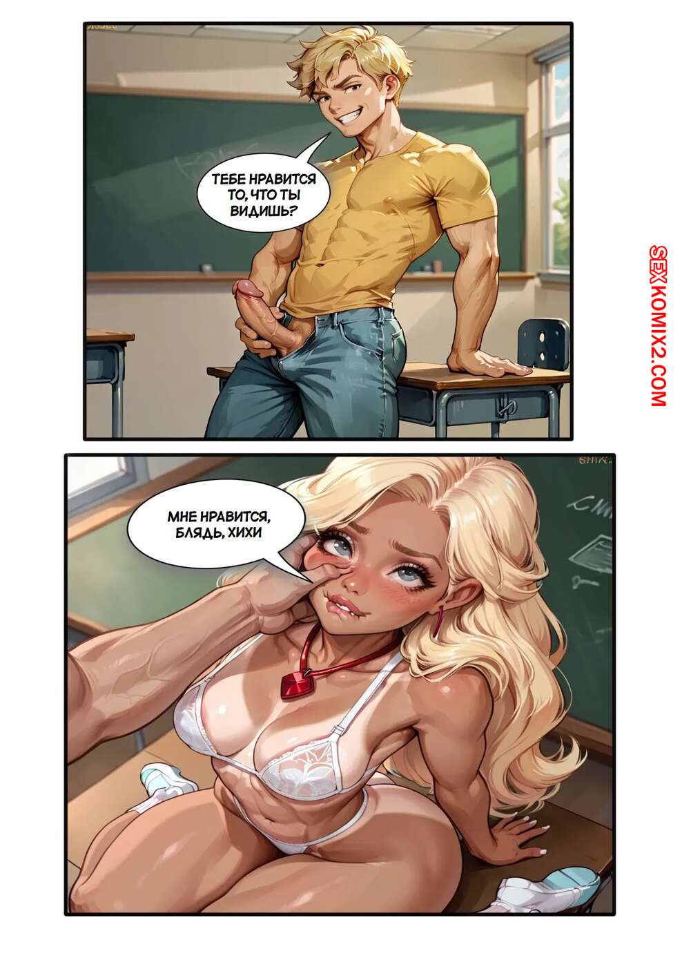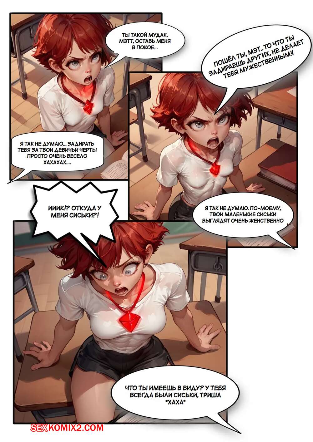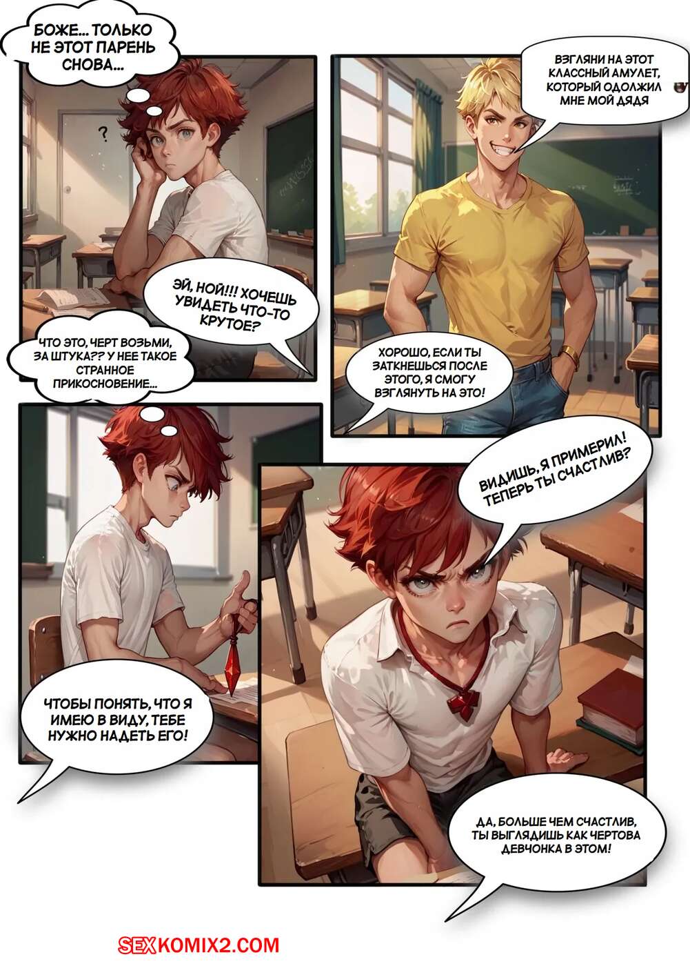 Порно комикс Мозги для Бимбо. Brains to Bimbo Молодой парень превратился в сексуальную возбужденную блондинку изза воздействия кулона. Девушка встала на колени перед парнем и отсосала его большой хуй, после чего он кончил ей в ротик.