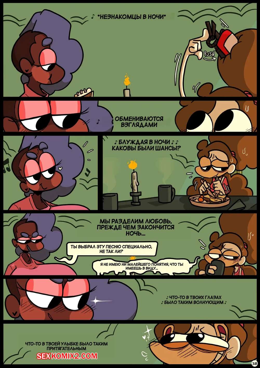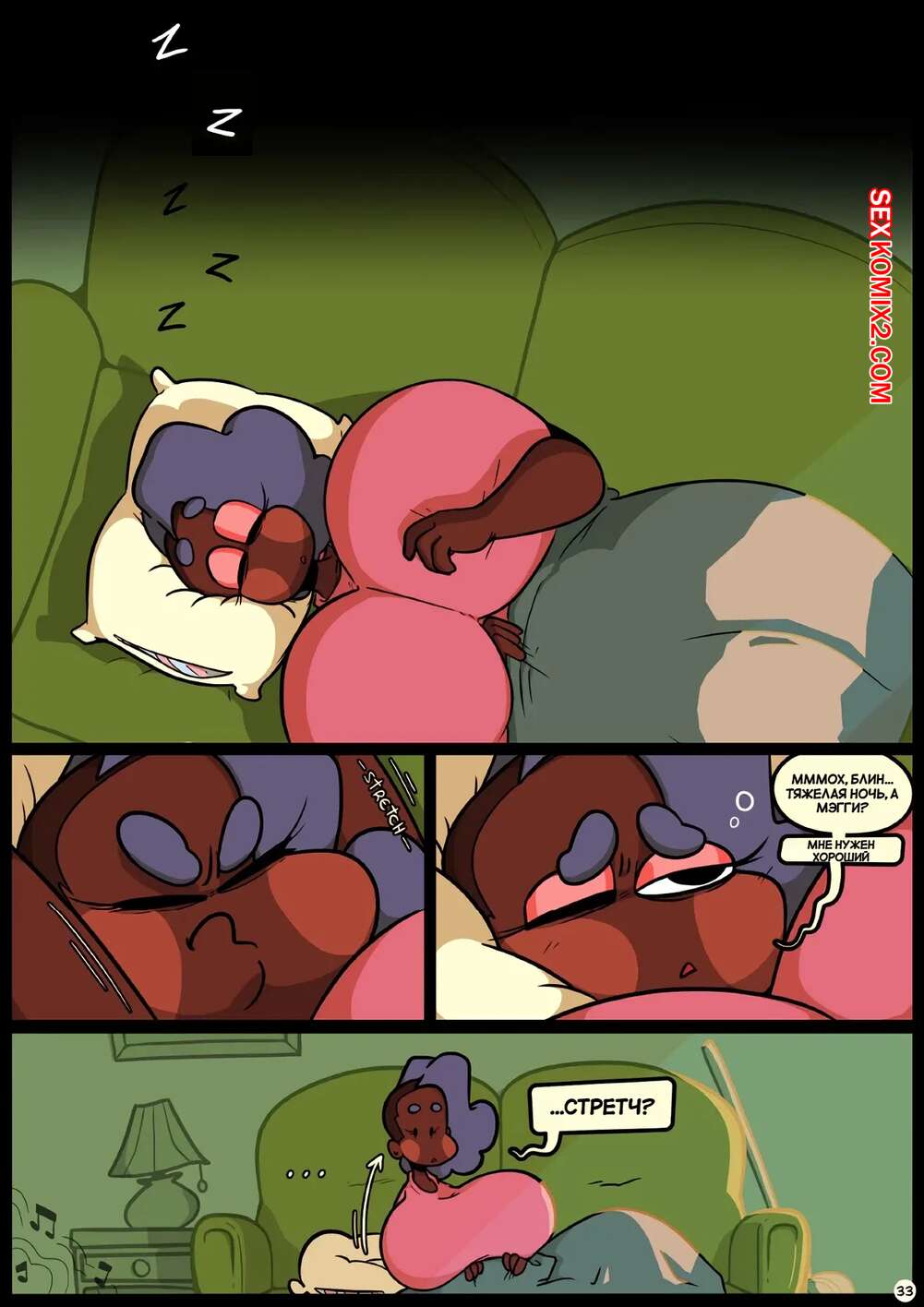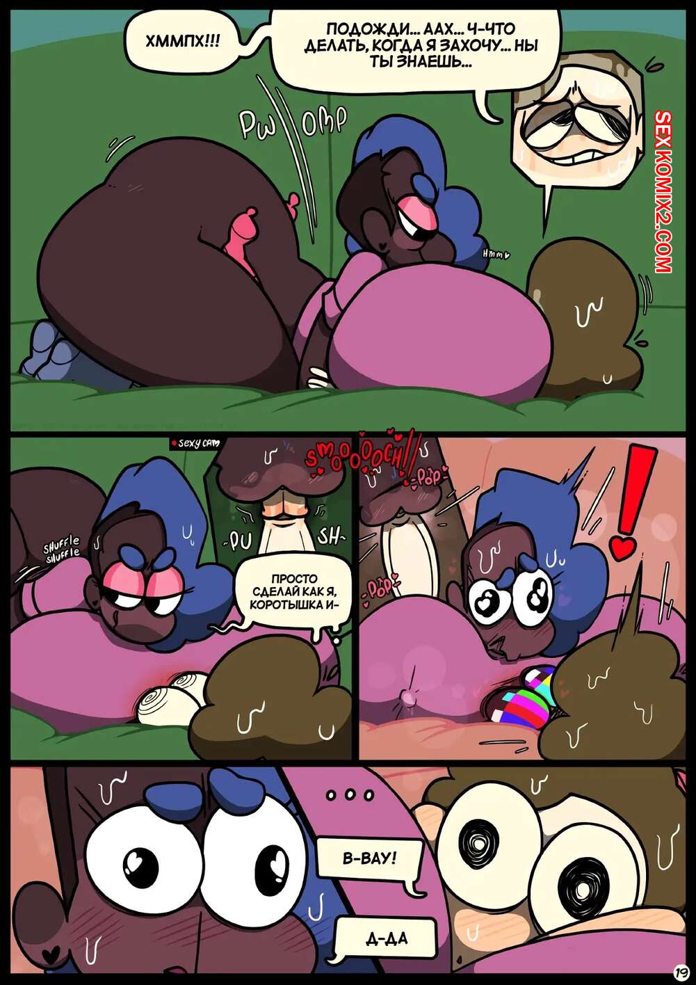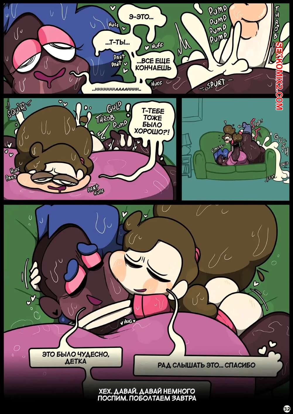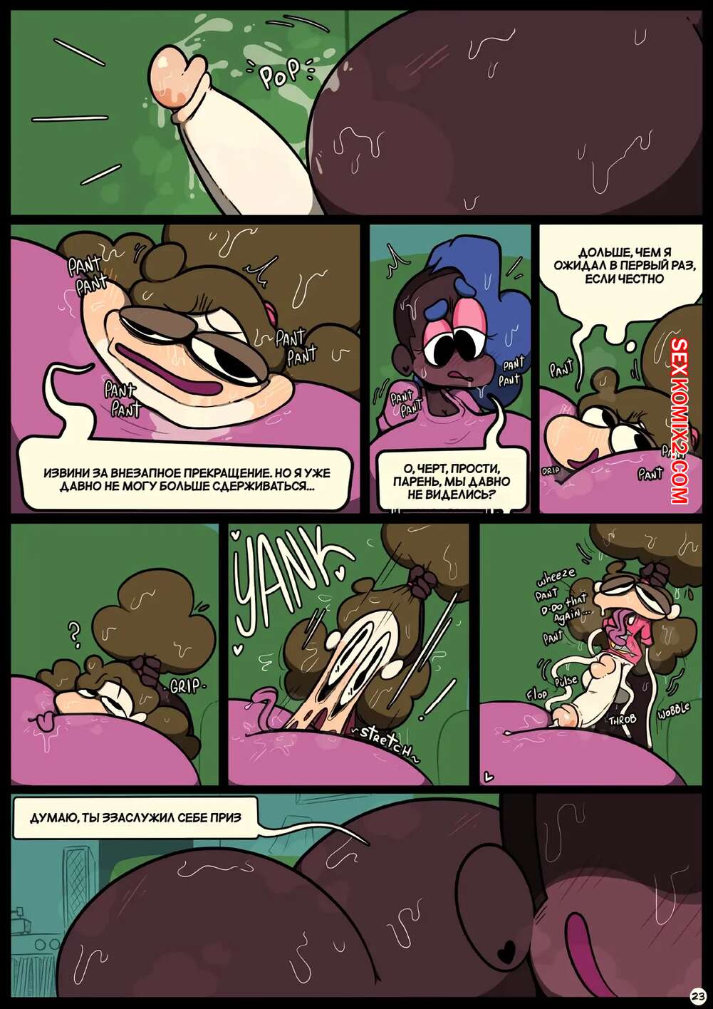 Порно комикс Фарс вместе с незнакомцами в ночи. Slapstick together strangers in the night Темнокожая брюнетка с огромными формами была очень возбуждена и хотела трахаться. Она уложила девушку с большим хуем на диван и стала скакать на ее хуй, получая огромное удовольствие.