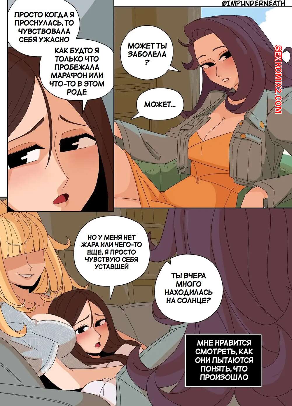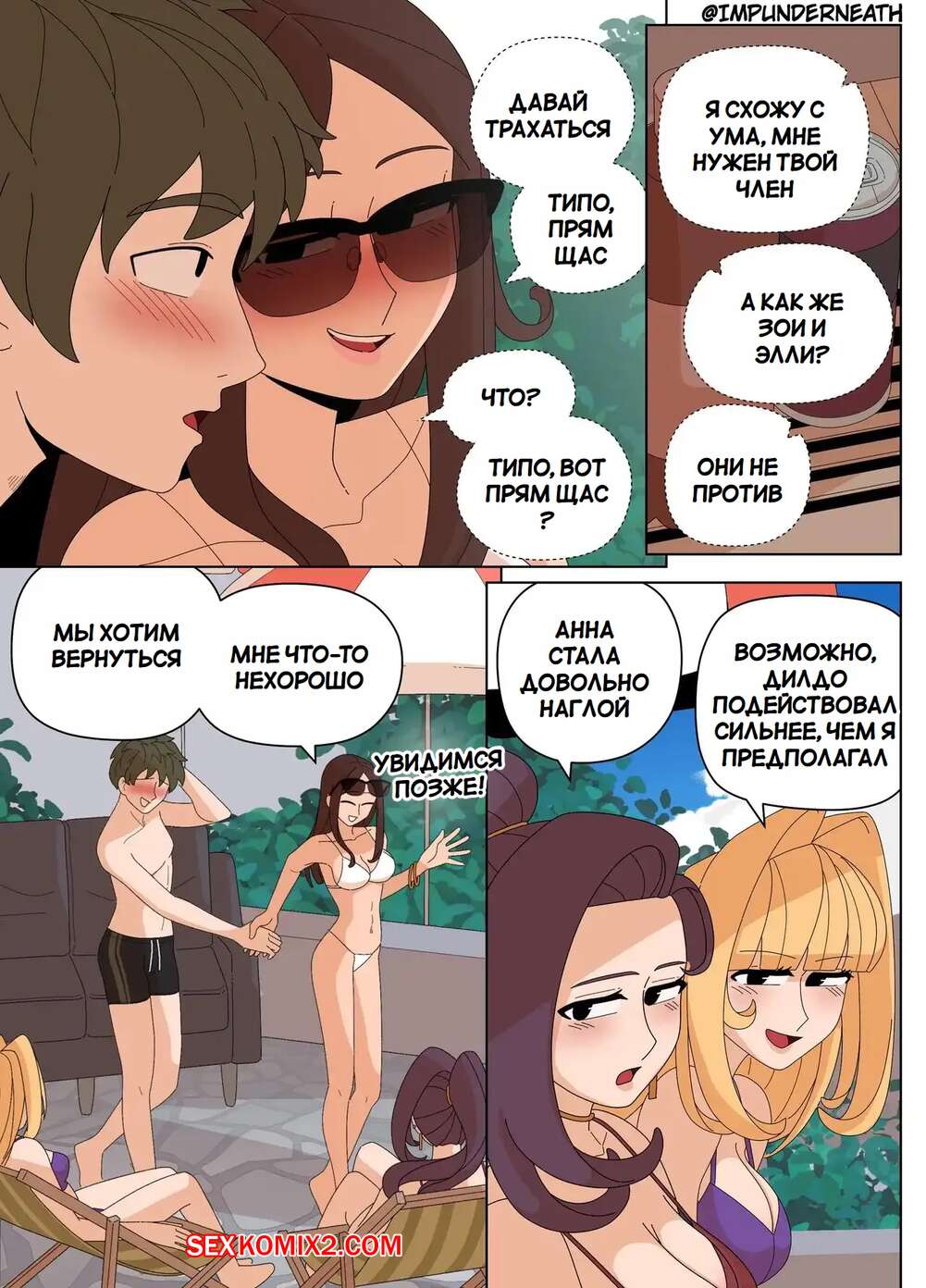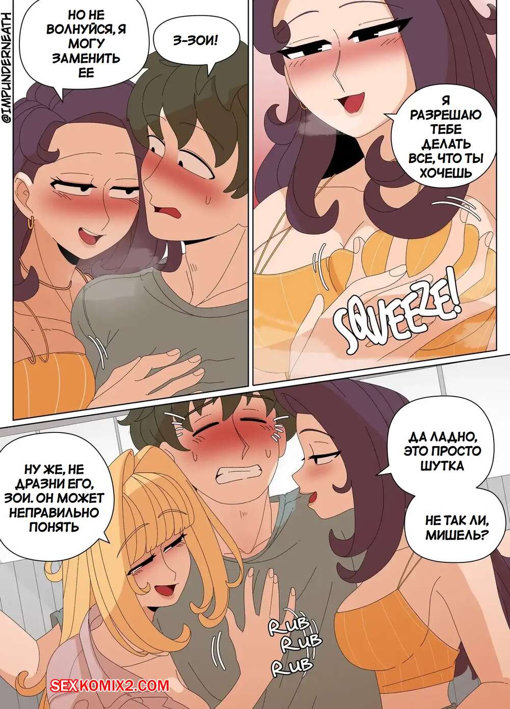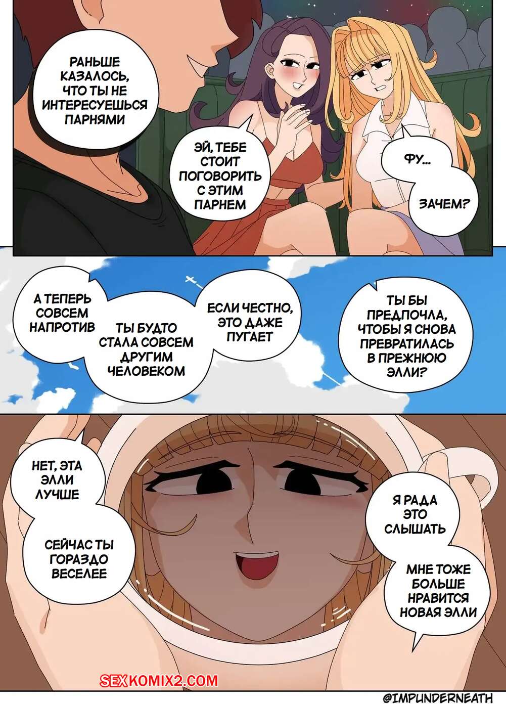 Порно комикс Комбинезон Элли 7. Ellie Skinsuit 7. Imp Underneath Горячие подруги с шикарными телами любят трахаться. Они раздеваются и ласкают друг дружку, а иногда веселятся со своим дружком с большим хуем, занимаясь с ним страстным сексом.