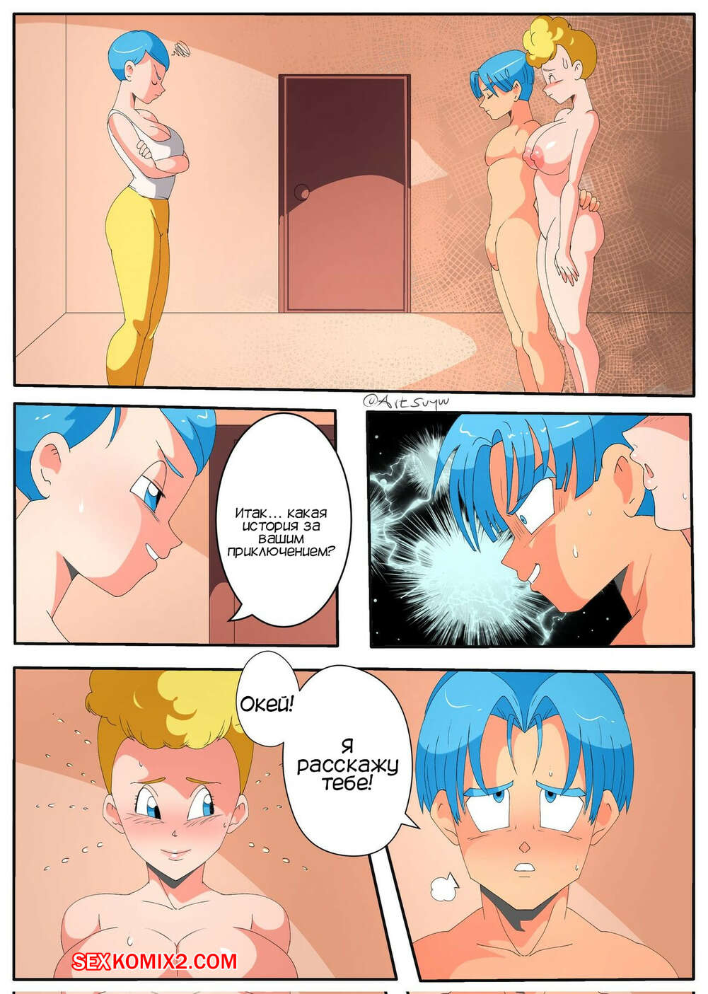 Порно комикс Dragon Ball. Транкс и Пэнчи пойманы. Trunks and Panchy are caught. Suyuu Art. Горячая блондинка милфа была очень возбуждена и решила повеселиться с Транксом. Она разделась и возбудила парня шикарным телом, после чего дала ему себя выебать.