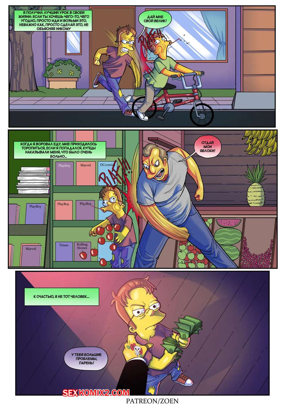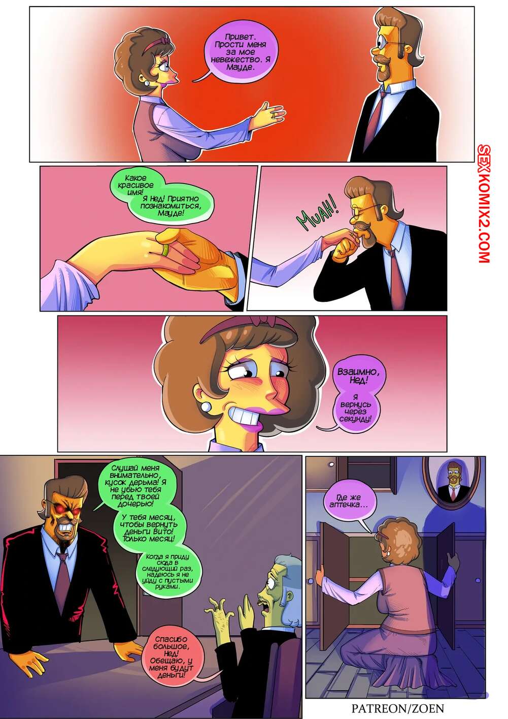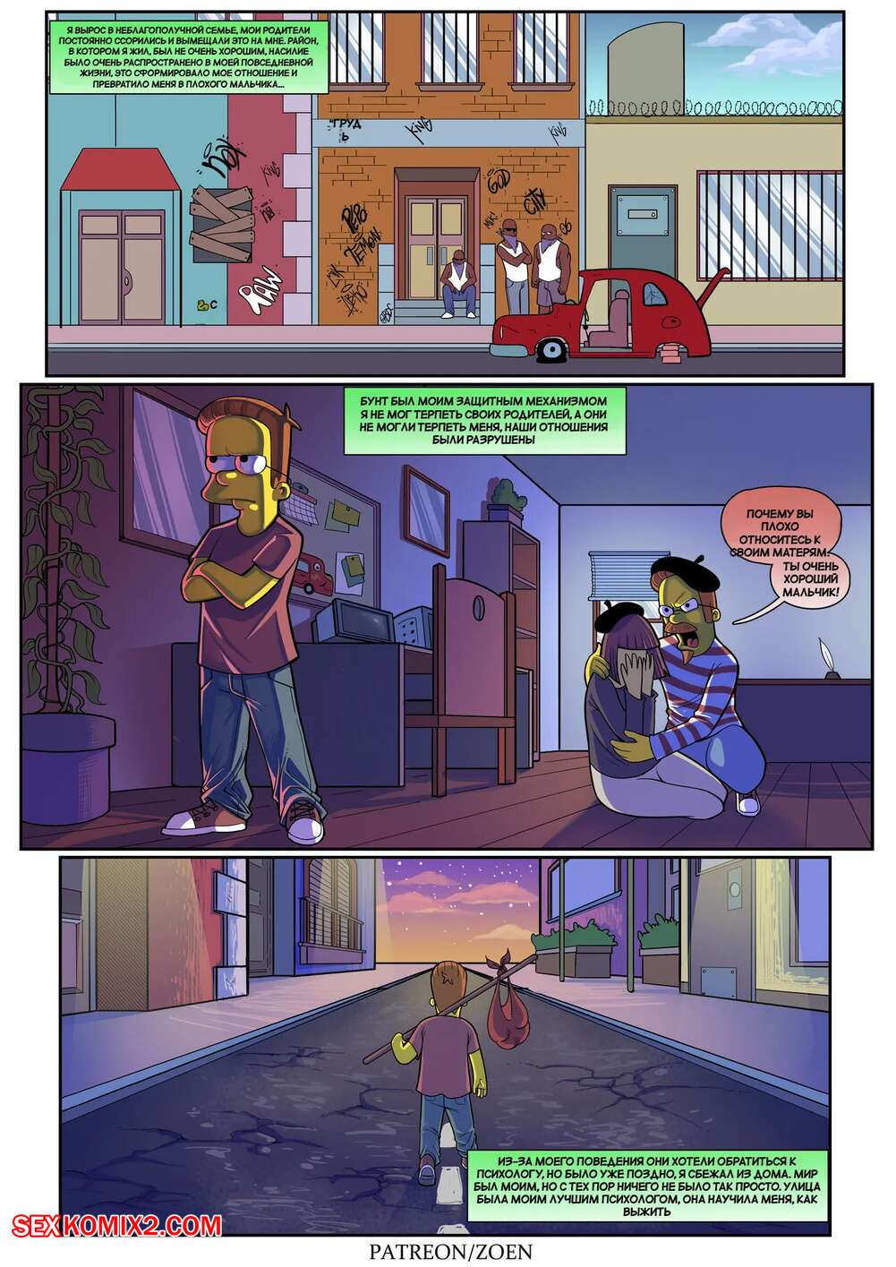 Порно комикс Симпсоны. Плохой парень. Bad Boy. Zoen Нэд проснулся в постели со своей сексуальной женой. Пока милфа спала голой, он стал рассказывать о своем детстве, чтобы поведать каким плохим парнем он был и как достиг такой шикарной женщины.