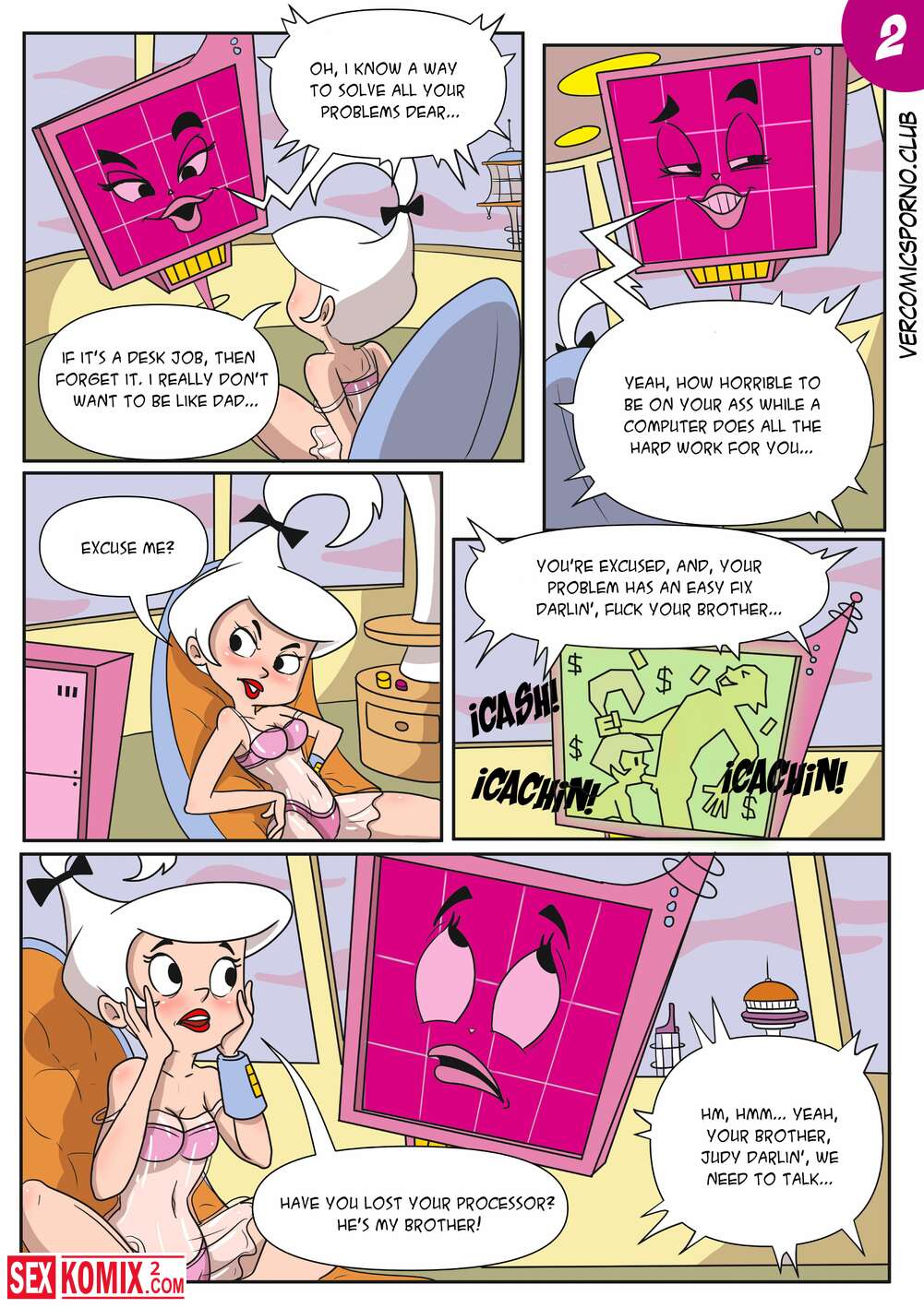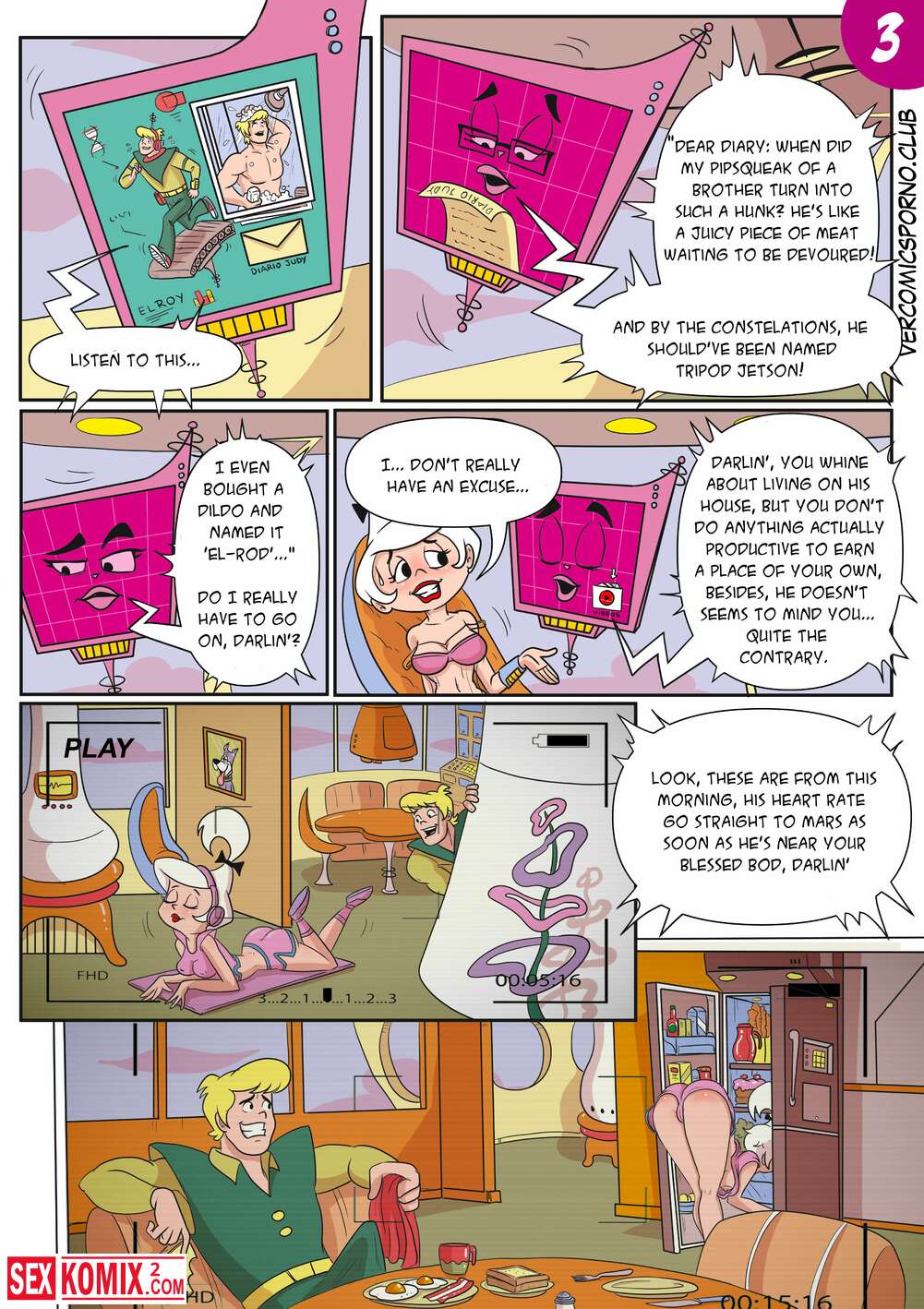 Порно комикс Джетсоны. E-Thot. Macergo. Английский. Парень увидел аппетитную блондинку, которая мастурбировала перед вебкамерой и пулей побежал к ней, чтобы выебать.