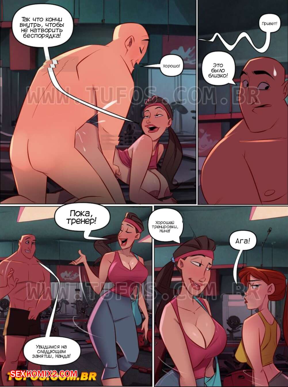 Порно комикс Дом мамы Джоаны. Часть 33. Casa da mae Joana. Tufos Горячая брюнетка пришла в спортзал и застала своего тренера после секса с клиенткой. Девушка разделась перед мужиком и дала ему себя выебать во все дырочки.